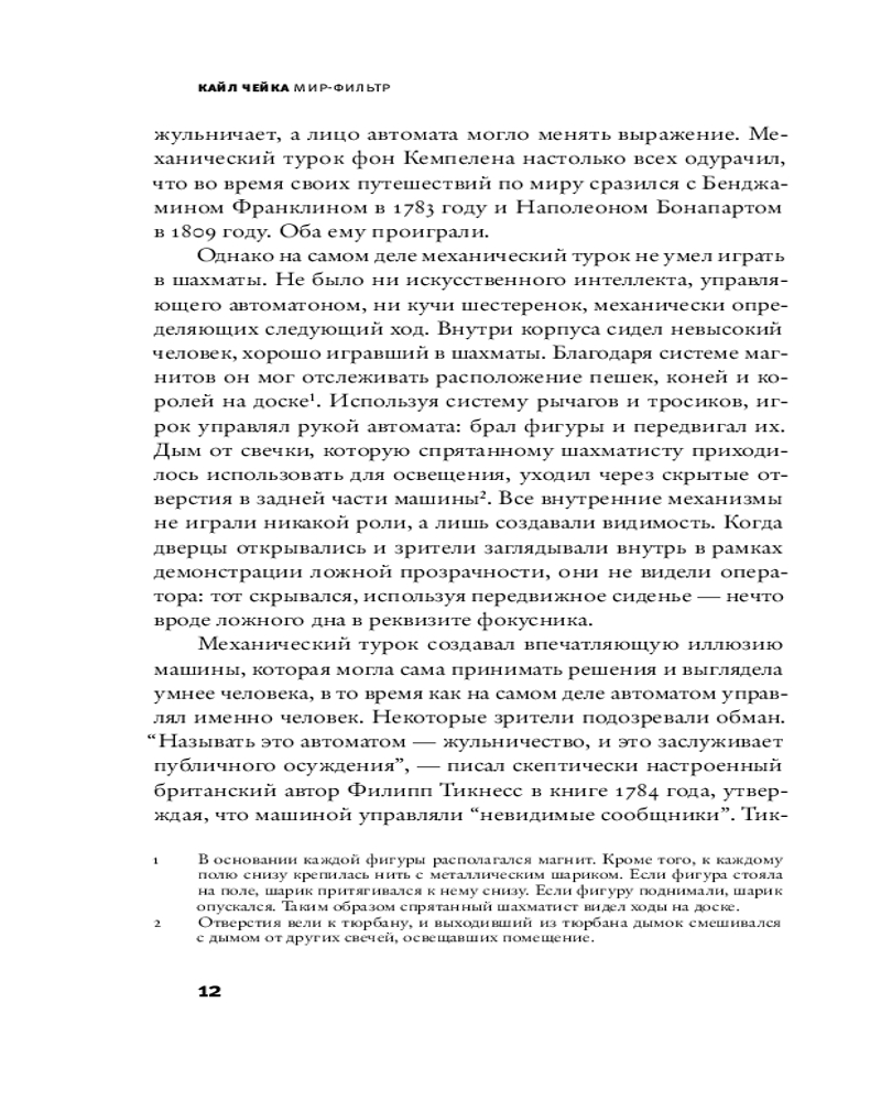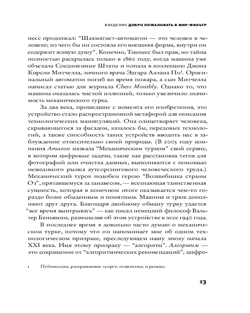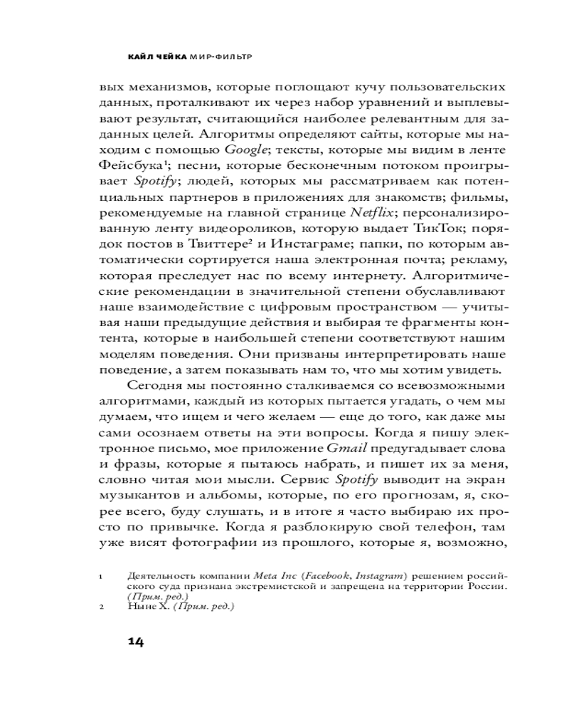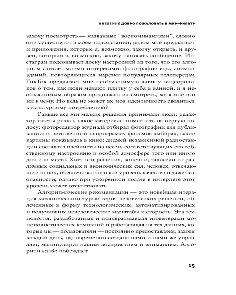 💳 Оплатить за товар можно при получении 🇰🇿 Есть бесплатная доставка по Казахстану от 1 дня 🎁 Копите бонусы с каждой покупки Серия: Corpus. Интернет с его рекомендательными алгоритмами захватил человечество. Каждый из нас живет в сглаженном и, по сути, обезличенном мире, пропущенном через фильтры. Алгоритмы определяют, какие песни мы слушаем и с какими друзьями поддерживаем связь. Они все больше влияют не только на то, какую культуру мы потребляем, но и на то, какая культура производится. Журналист Кайл Чейка дает читателю увлекательный экскурс в историю появления и развития алгоритмической подачи информации, рассказывает о сегодняшних реалиях, в которых она играет принципиальную роль для нашей культуры, о плюсах и минусах такого положения дел, а также предлагает осознанные решения, которые помогут сохранить свое собственное «я» в эпоху алгоритмов. |