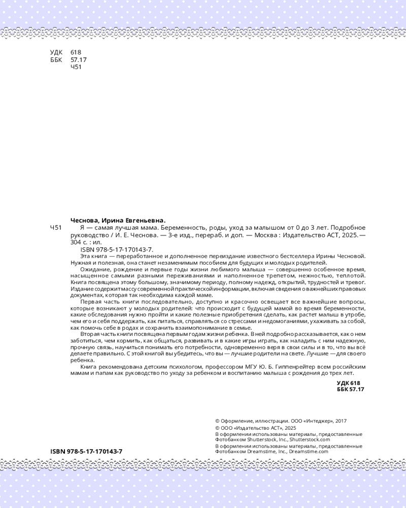 💳 Оплатить за товар можно при получении 🇰🇿 Есть бесплатная доставка по Казахстану от 1 дня 🎁 Копите бонусы с каждой покупки Серия: Вопрос - ответ Книга рекомендована детским психологом, профессором МГУ Ю.Б. Гиппенрейтер всем российским мамам и папам как руководство по воспитанию и уходу за малышом от рождения до 3 лет. Ирина Чеснова — практикующий психолог, EMDR- и IFS-терапевт. Член Общества семейных консультантов и психотерапевтов. Автор книг «Я — скоро мама», «Большая книга для детей. О страхах, дружбе, школе, первой любви и вере в себя», «Книга про ЭТО», «Как справляться с эмоциями, понимать себя и не давать в обиду», «Взрослые игры», «Воспитание любовью» и др. Ведет частную практику. Замужем, мама Даши, Гриши и Ульяны. Это незаменимое пособие для молодых и будущих родителей. Переработанное и дополненное издание бестселлера Ирины Чесновой, содержит обновленный правовой раздел с полной информацией по пособиям и выплатам на государственном уровне. |