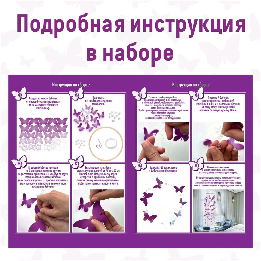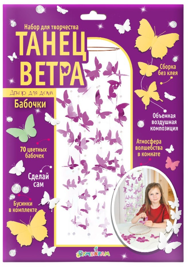 Bumbaram Набор для творчества «Танец ветра. Бабочки»В данный момент этот товар отсутствует в продаже. Возможно, у нас найдется аналогичный или похожий товар здесь. Хотите увидеть, как танцует ветер? Создайте это необычное украшение для комнаты и повесьте около окна. Декор с фиолетовыми бабочками будет нежно кружиться в чудесном танце при малейшем дуновении ветерка, а бусинки будут блестеть и переливаться на свету. Сделать такое украшение очень просто — в наборе есть пошаговая инструкция. Клей не понадобится. Заготовки-бабочки уже вырезаны по контуру, поэтому ножницы понадобятся только, чтобы отрезать леску. |