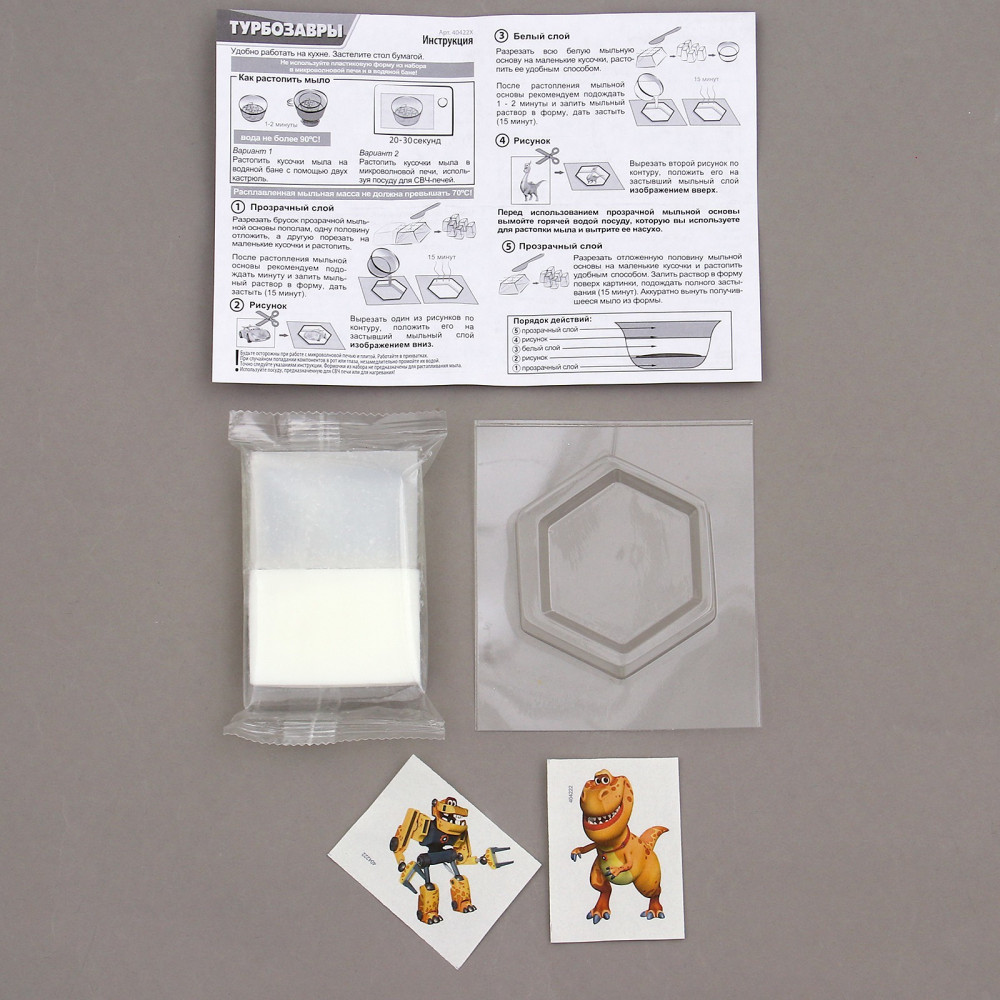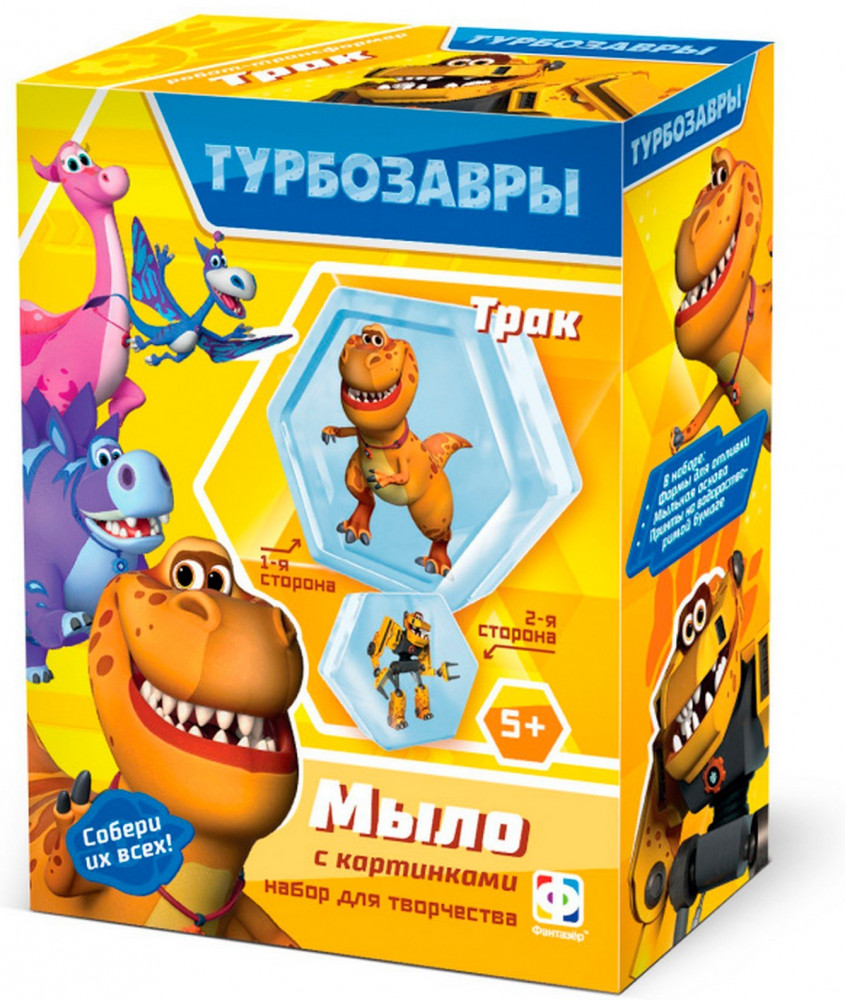 Турбозавры Трак — набор для создания мыла с картинками. Шестиугольные брусочки украшены наклейками с изображением забавных динозавров. С одной стороны — дружелюбный герой, а с другой — необычный диноробот. В каждом наборе свой персонаж. Соберите целую коллекцию!
