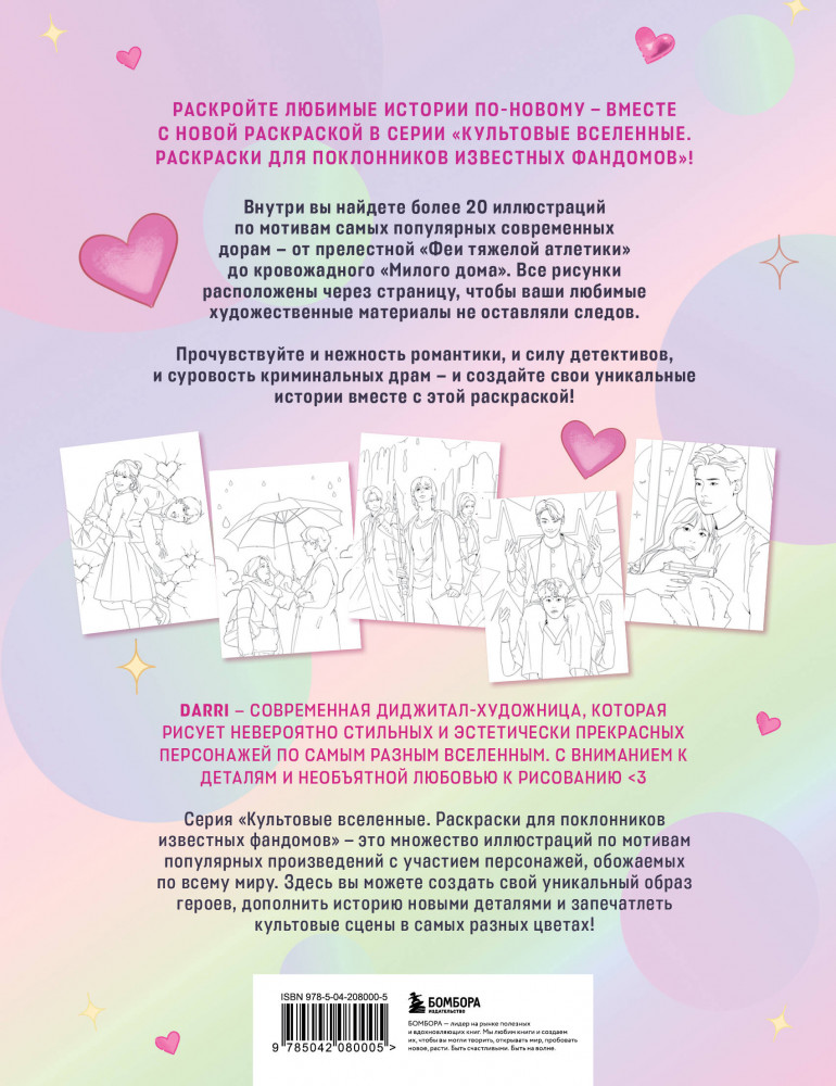 💳 Оплатить за товар можно при получении 🇰🇿 Есть бесплатная доставка по Казахстану от 1 дня 🎁 Копите бонусы с каждой покупки Серия: Культовые вселенные. Раскраски для поклонников известных фандомов Добро пожаловать в мир корейских тайтлов, где каждый кадр наполнен эмоциями, увлекательными сюжетами и неповторимым восточным колоритом! Благодаря таланту художницы Darri вы сможете не только насладиться историей, но и добавить яркие цвета в иллюстрации, в которых отлично отражается дух популярных телесериалов. |
