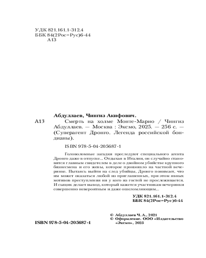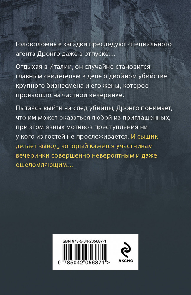 Серия: Суперагент Дронго. Легенда российской бондианы Головоломные загадки преследуют специального агента Дронго даже в отпуске... Отдыхая в Италии, он случайно становится главным свидетелем в деле о двойном убийстве крупного бизнесмена и его жены, которое произошло на частной вечеринке. Пытаясь выйти на след убийцы, Дронго понимает, что им может оказаться любой из приглашенных, при этом явных мотивов преступления ни у кого из гостей не прослеживается. И сыщик делает вывод, который кажется участникам вечеринки совершенно невероятным и даже ошеломляющим... |