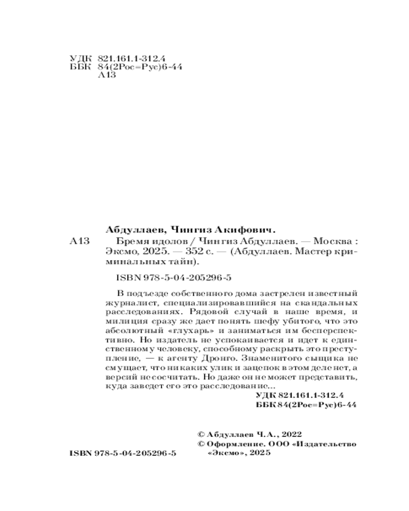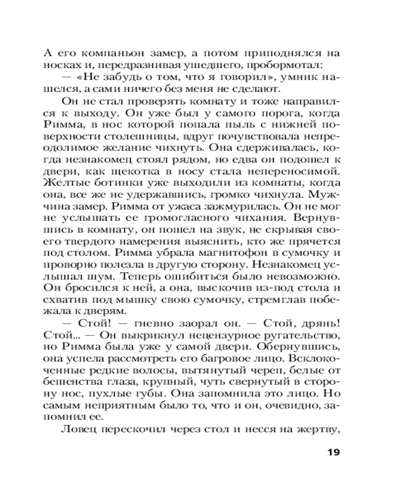 💳 Оплатить за товар можно при получении 🇰🇿 Есть бесплатная доставка по Казахстану от 1 дня 🎁 Копите бонусы с каждой покупки Серия: Абдуллаев. Мастер криминальных тайн (обложка) В подъезде собственного дома застрелен известный журналист, специализировавшийся на скандальных расследованиях. Рядовой случай в наше время, и милиция сразу же дает понять шефу убитого, что это абсолютный «глухарь» и заниматься им бесперспективно. Но издатель не успокаивается и идет к единственному человеку, способному раскрыть это преступление, — к агенту Дронго. Знаменитого сыщика не смущает, что никаких улик и зацепок в этом деле нет, а версий не сосчитать. Но даже он не может представить, куда заведет его это расследование... |