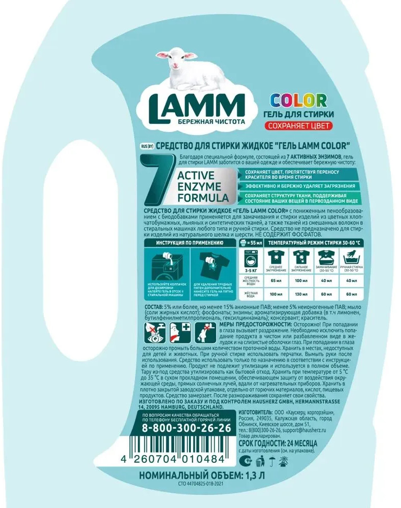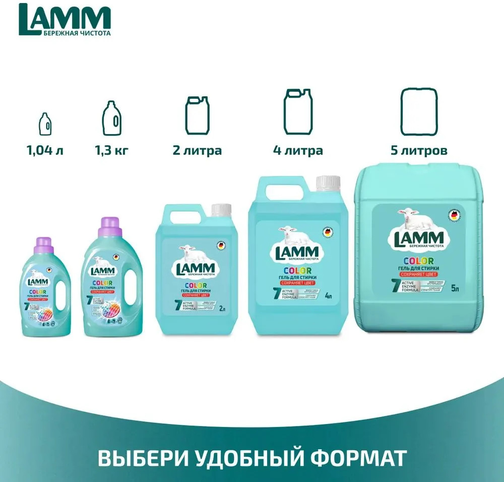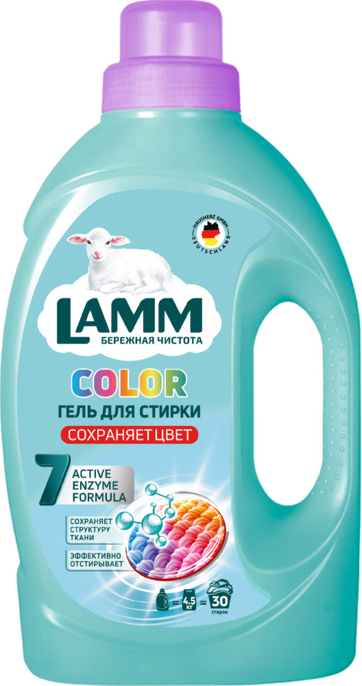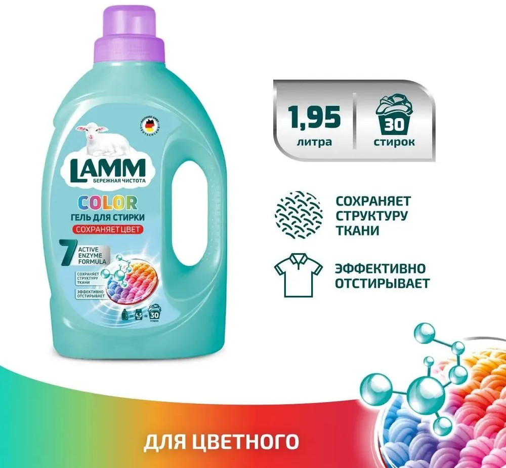 Гель для стирки Lamm «Color» с пониженным пенообразованием с биодобавками эффективно и бережно отстирывает цветные изделия из хлопчатобумажных, льняных и синтетических тканей, а также тканей из смешанных волокон в стиральных машинах любого типа и при ручной стирке. Устраняет любые неприятные запахи. Особая 7-ми компонентная формула эффективно удаляет широкий спектр многослойных пятен, включая масляные, жирные, липкие, белковые и крахмальные пятна. Входящие в состав энзимы глубоко проникают в волокна ткани, высвобождают частицы грязи и возвращают живой цвет любимым вещам, гарантируя высокое качество стирки. Средство ухаживает за тканями, благодаря чему одежда и белье становятся не только чистыми, но и приятными на ощупь. Не содержит фосфатов. Бесфосфатный гель для стирки LAMM эффективно удаляет разные типы загрязнений, благодаря 7-ми компонентной энзимной формуле.