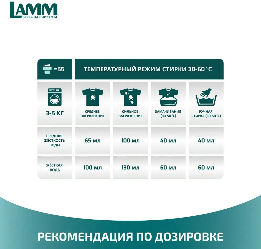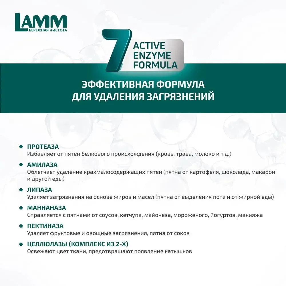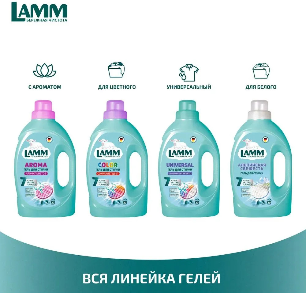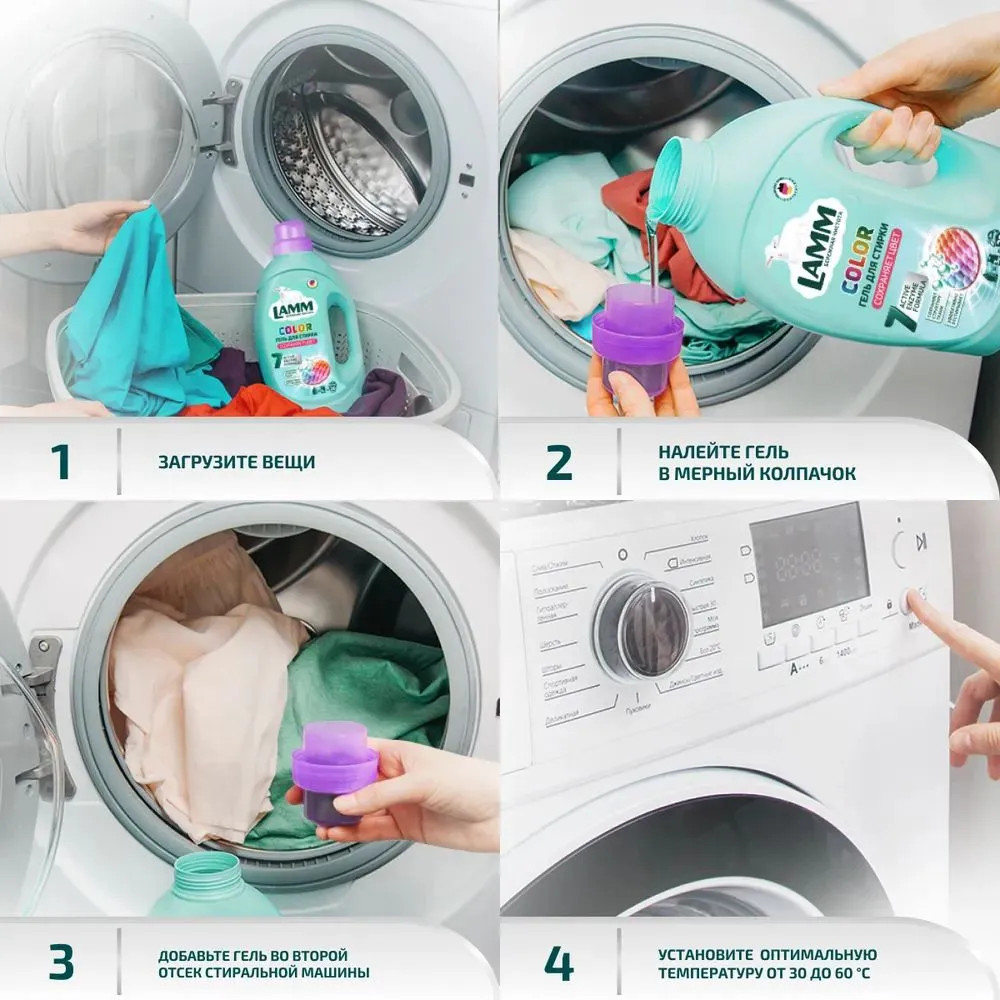 Гель для стирки Lamm «Color» с пониженным пенообразованием с биодобавками эффективно и бережно отстирывает цветные изделия из хлопчатобумажных, льняных и синтетических тканей, а также тканей из смешанных волокон в стиральных машинах любого типа и при ручной стирке. Устраняет любые неприятные запахи. Особая 7-ми компонентная формула эффективно удаляет широкий спектр многослойных пятен, включая масляные, жирные, липкие, белковые и крахмальные пятна. Входящие в состав энзимы глубоко проникают в волокна ткани, высвобождают частицы грязи и возвращают живой цвет любимым вещам, гарантируя высокое качество стирки. Средство ухаживает за тканями, благодаря чему одежда и белье становятся не только чистыми, но и приятными на ощупь. Не содержит фосфатов. Бесфосфатный гель для стирки LAMM эффективно удаляет разные типы загрязнений, благодаря 7-ми компонентной энзимной формуле.