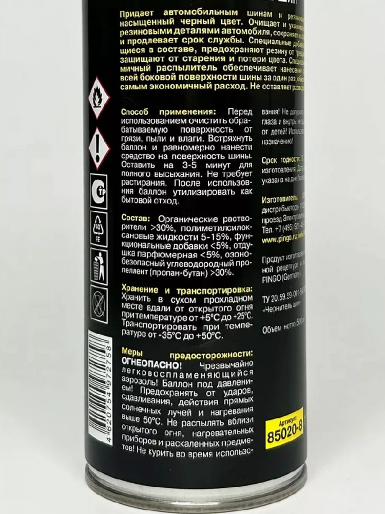 Придает автомобильным шинам насыщенный черный цвет. Защищает от трещин и износа. Восстанавливает первоначальный вид. Специальный экономичный распылитель обеспечивает нанесение средства по всей боковой поверхности шины за один раз, обеспечивая экономичный расход.