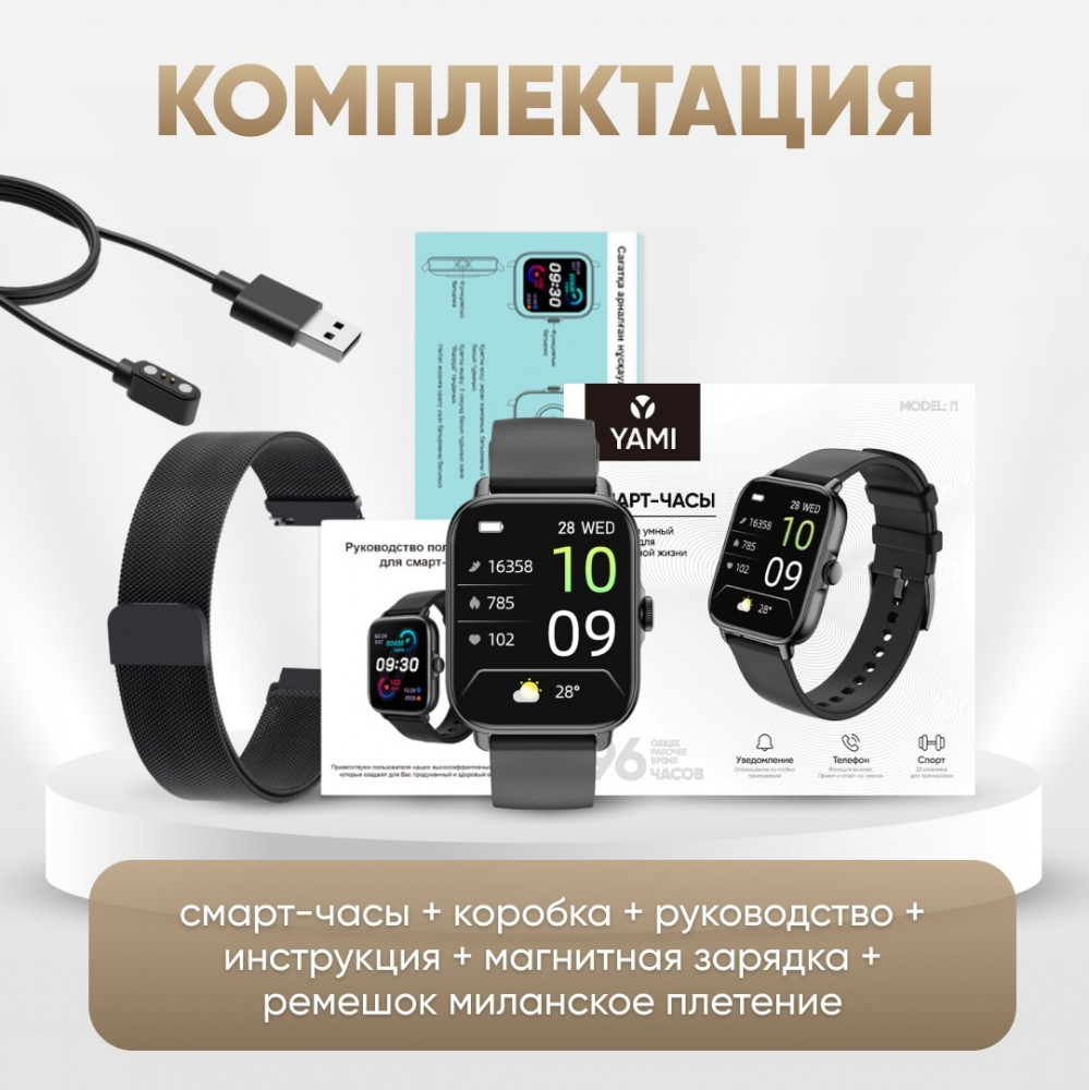 Смарт часы YAMI i1 серии предлагают множество функций для различных сфер жизни: от занятий спортом и фитнесом до туризма и походов. Умные часы помогут вам всегда оставаться на связи. Получайте уведомления со всех приложений и мессенджеров (функции ответа нет). Встроенный динамик и микрофон позволяют совершать и принимать звонки, если ваш телефон не под рукой. С их помощью можно отслеживать количество пройденных шагов или расстояние, измерять пульс и артериальное давление, проверять уровень кислорода в крови и даже анализировать качество сна. Они имеют оптимальный размер, стильно смотрятся на руке и подходят как для взрослых, так и подростков.