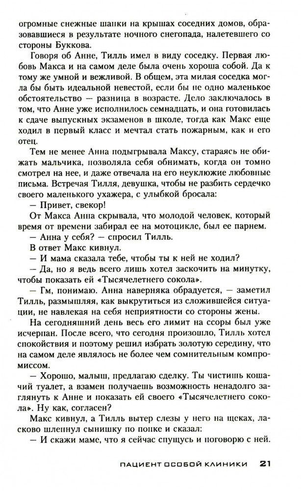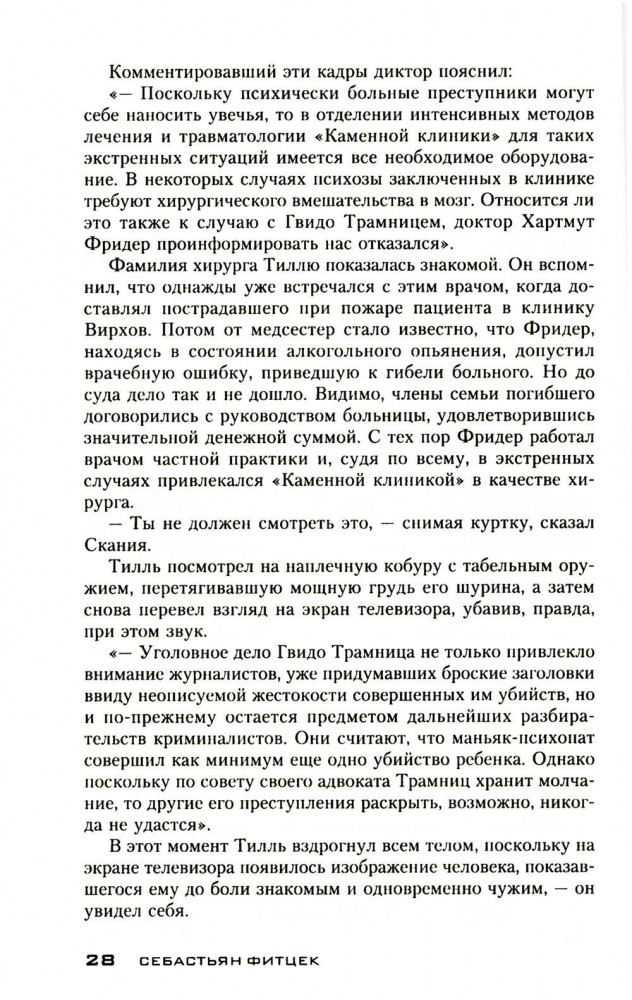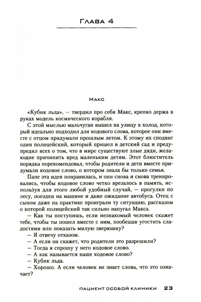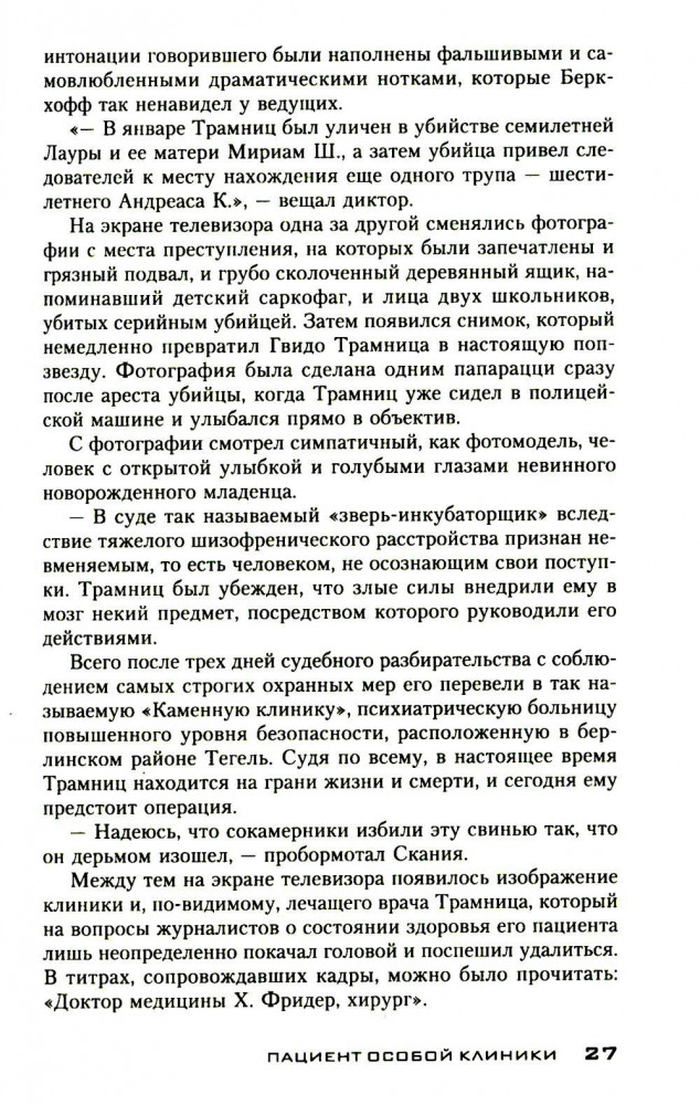 💳 Оплатить за товар можно при получении 🇰🇿 Есть бесплатная доставка по Казахстану от 1 дня 🎁 Копите бонусы с каждой покупки Серия: Иностранный детектив У Тилля Беркхоффа бесследно пропадает сын Макс. Все улики свидетельствуют о том, что мальчик стал жертвой маньяка Гвидо Трамница. Преступник арестован полицией и признался в похищении и убийстве нескольких маленьких детей. Место их захоронения серийный убийца указал, однако о судьбе Макса хранит упорное молчание. Суд признает садиста невменяемым и отправляет его в строго охраняемую психиатрическую лечебницу. Следствию известно о том, что психопат вел дневник, где описывал всё, что сделал с жертвами, но найти записи не удалось. Отчаявшийся отец обращается за содействием к знакомому сотруднику полиции, и тот делает ему невероятное предложение: стать пациентом этой особой клиники. Так он сможет оказаться ближе к детоубийце и заставить его признаться. Того, чем обернется эта отчаянная попытка, не ожидал никто. |