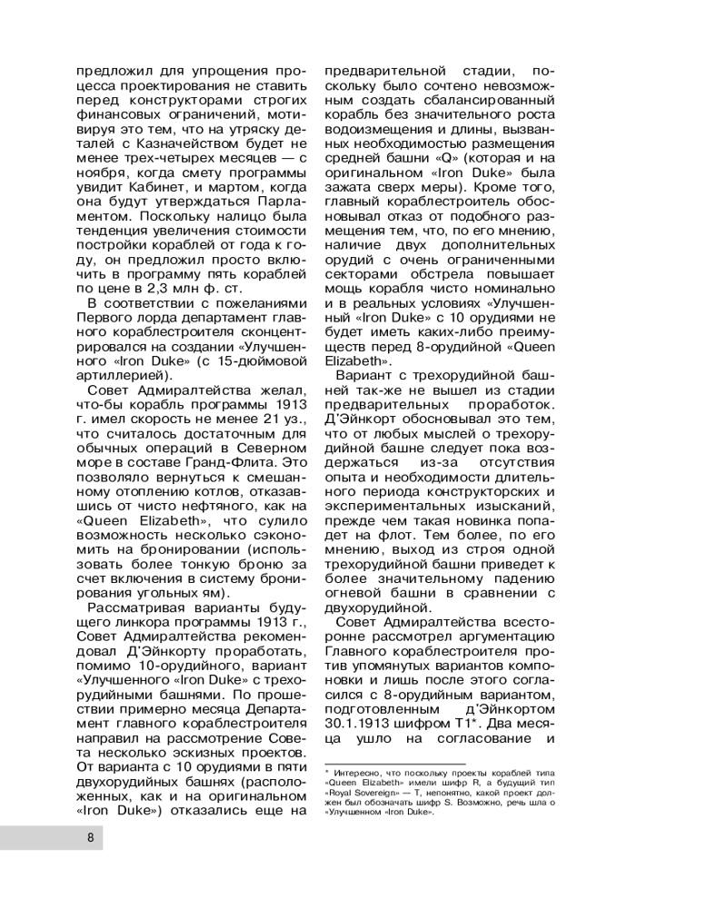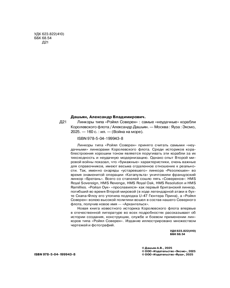 💳 Оплатить за товар можно при получении 🇰🇿 Есть бесплатная доставка по Казахстану от 1 дня 🎁 Копите бонусы с каждой покупки Серия: Война на море Линкоры типа «Ройял Соверен» принято считать самыми «неудачными» линкорами Королевского флота. Среди историков кораблестроения хорошим тоном является поругивать эти корабли за их тихоходность и неудачную модернизацию. Однако опыт Второй мировой войны показал, что «бумажные» характеристики, очень важные для справочников, имеют весьма отдаленное отношение к реальности. Так, именно снаряды «устаревшего» линкора «Резолюшен» во время знаменитой операции «Катапульта» уничтожили французский линкор «Бретань». Всего со стапелей сошло пять «Соверенов»: HMS Royal Sovereign, HMS Revenge, HMS Royal Oak, HMS Resolution и HMS Ramillies. «Ройал Оук» «прославился» как первый британский линкор, погибший во время Второй мировой (в ходе легендарной атаки в бухте Скапа-Флоу его утопила подлодка U-47 Гюнтера Прина), а «Ройял Соверен» волею высокой политики вошел в состав нашего Северного флота, получив новое имя — «Архангельск». |