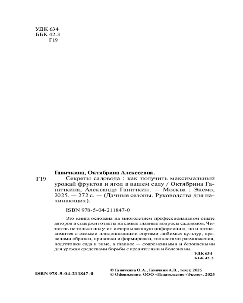 В данный момент этот товар отсутствует в продаже. Возможно, у нас найдется аналогичный или похожий товар здесь. Серия: Дачные сезоны. Руководства для начинающих Как добиться максимального урожая фруктов и ягод в саду, огородив его от болезней и вредителей? Октябрина Ганичкина — кандидат сельскохозяйственных наук, постоянная ведущая рубрик по приусадебному хозяйству в популярных телепередачах. Александр Ганичкин — дипломированный ученый-агроном. Эта книга объединяет многолетний профессиональный опыт авторов и содержит ответы на самые частые вопросы, которые возникают при выращивании плодовых и ягодных культур. Вы найдете информацию о самых плодоносящих сортах, посадке и пересадке, прививке, обрезке, формировке, подготовке сада к зиме, а главное — о безопасных и современных средствах защиты от вредителей и болезней. |