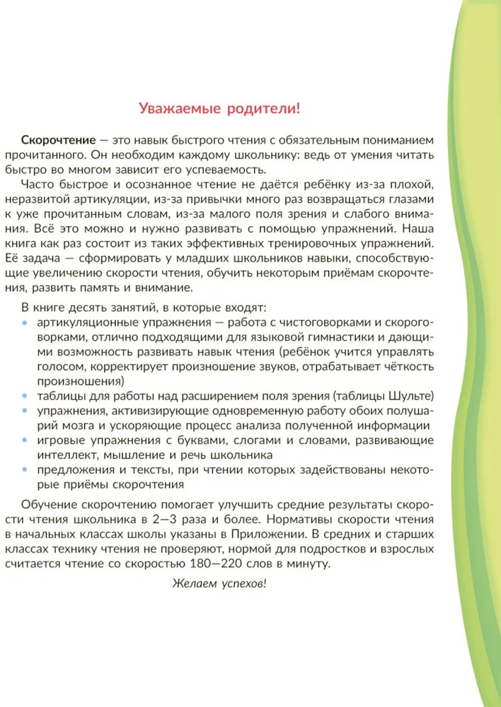 💳 Оплатить за товар можно при получении 🇰🇿 Есть бесплатная доставка по Казахстану от 1 дня 🎁 Копите бонусы с каждой покупки Серия: Домашний репетитор Скорочтение — это навык увеличения скорости чтения с обязательным пониманием содержания прочитанного. Такой навык необходим каждому школьнику, потому что от умения читать быстро во многом зависит его успешность. Книга адресована всем школьникам — задания в ней могут выполнять ученики любого класса, которые уже умеют читать. Быстрое, грамотное, осознанное и выразительное чтение можно и нужно развивать тренировкой. Книга состоит из подобных тренировочных упражнений. Задача учебного пособия — сформировать у школьников навыки, увеличивающие скорость чтения, обучить их некоторым приёмам скорочтения, развить память и внимание ребёнка. Приёмы скорочтения помогают улучшить средние показатели техники чтения у школьников в 2-3 раза и более. |