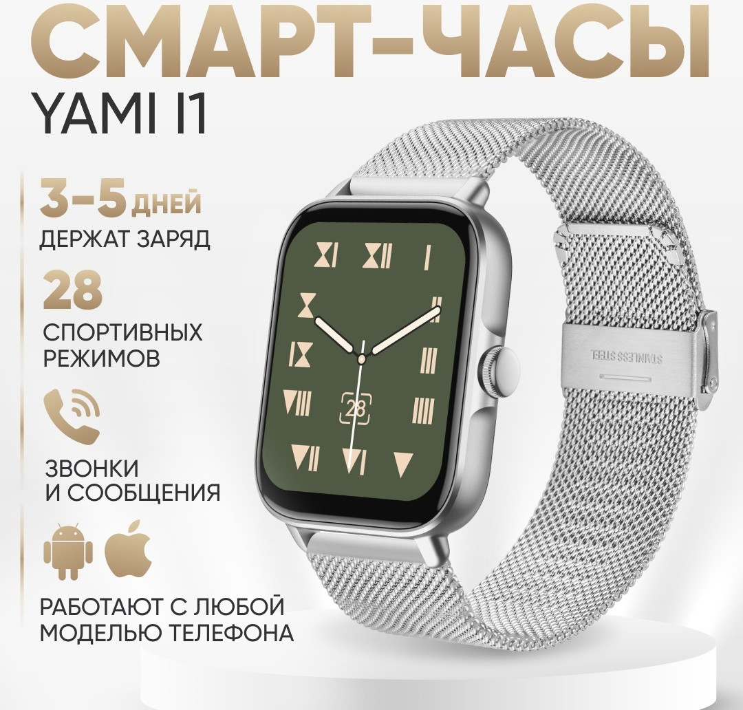 Смарт часы YAMI i1 серии предлагают множество функций для различных сфер жизни: от занятий спортом и фитнесом до туризма и походов. Умные часы помогут вам всегда оставаться на связи. Получайте уведомления со всех приложений и мессенджеров (функции ответа нет). Встроенный динамик и микрофон позволяют совершать и принимать звонки, если ваш телефон не под рукой. С их помощью можно отслеживать количество пройденных шагов или расстояние, измерять пульс, проверять уровень кислорода в крови и даже анализировать качество сна. Они имеют оптимальный размер, стильно смотрятся на руке и подходят как для взрослых, так и подростков.⠀