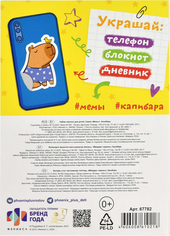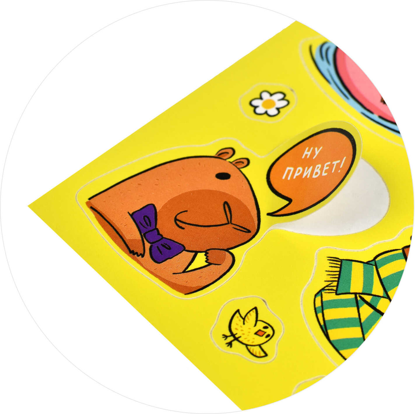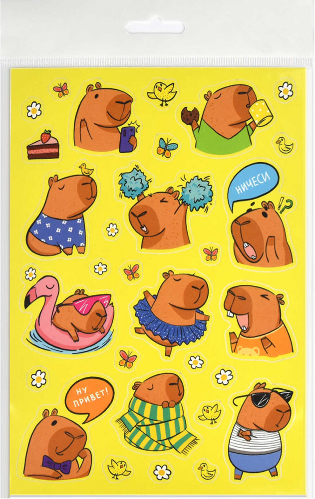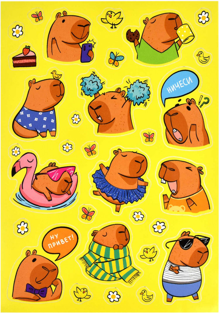 Яркие наклейки с невозмутимой капибарой украсят твой телефон, дневник, ежедневник или ноутбук. Наклеивай стикеры, чтобы удивить друзей, поднять себе настроение и сделать свои вещи непохожими на другие. Стикеры многоразовые и не оставляют следов.