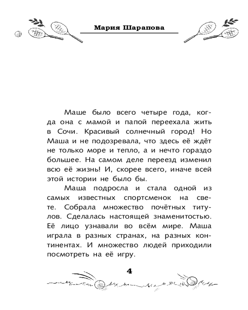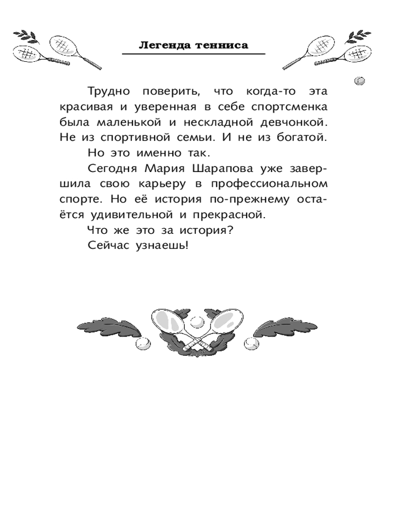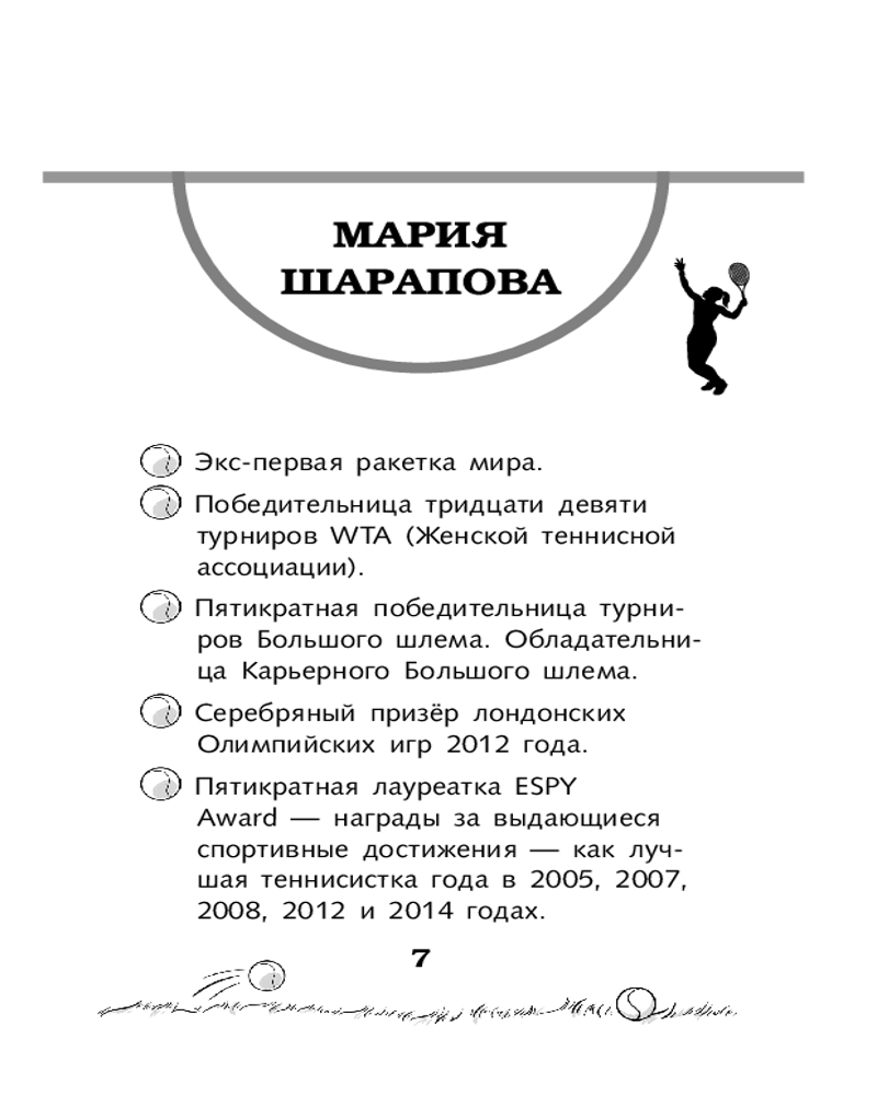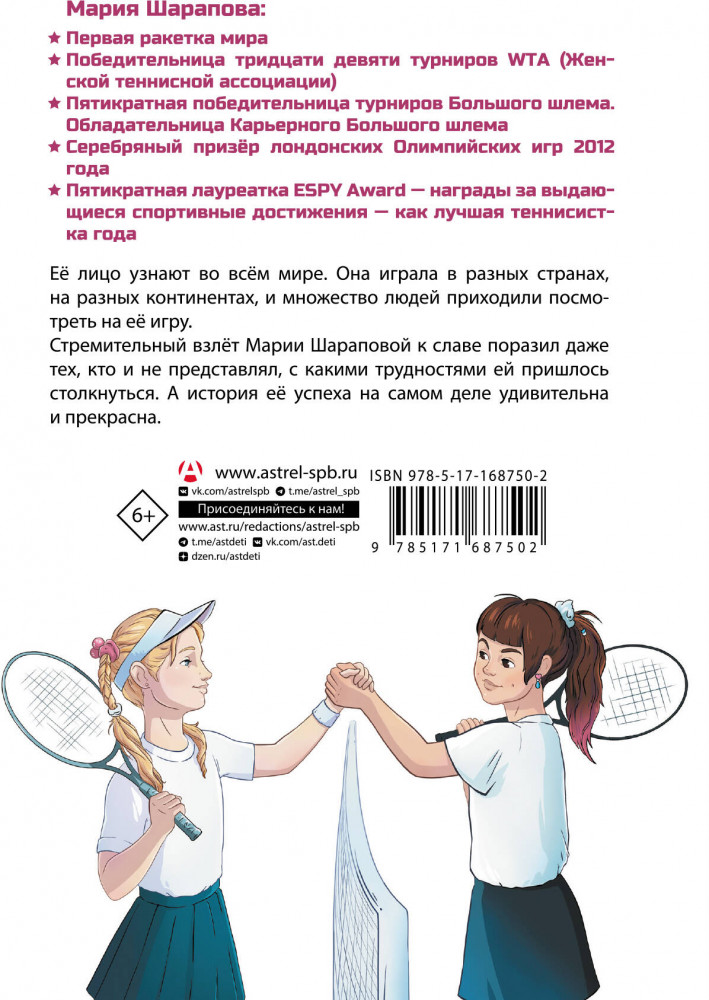 💳 Оплатить за товар можно при получении 🇰🇿 Есть бесплатная доставка по Казахстану от 1 дня 🎁 Копите бонусы с каждой покупки Серия: Звёзды отечественного спорта для детей Мария Шарапова — первая ракетка мира, победительница тридцати девяти турниров WTA (Женской теннисной ассоциации), пятикратная победительница турниров Большого шлема, обладательница Карьерного Большого шлема, серебряный призёр лондонских Олимпийских игр 2012 года, пятикратная лауреатка ESPY Award — награды за выдающиеся спортивные достижения — как лучшая теннисистка года. Её лицо узнают во всём мире. Она играла в разных странах, на разных континентах, и множество людей приходили посмотреть на её игру. Стремительный взлёт Марии Шараповой к славе поразил даже тех, кто и не представлял, с какими трудностями ей пришлось столкнуться. А история её успеха на самом деле удивительна и прекрасна. |