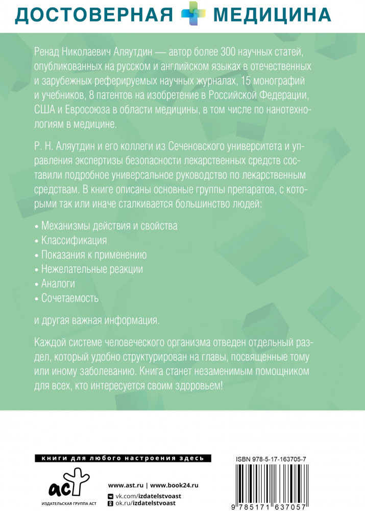 💳 Оплатить за товар можно при получении 🇰🇿 Есть бесплатная доставка по Казахстану 🎁 Копите бонусы с каждой покупки Серия: Достоверная медицина Ренад Николаевич Аляутдин — автор более 300 научных статей, опубликованных на русском и английском языках в отечественных и зарубежных реферируемых научных журналах, 15 монографий и учебников, 8 патентов на изобретение в Российской Федерации, США и Евросоюза в области медицины, в том числе по нанотехнологиям в медицине. Р. Н. Аляутдин и его коллеги из Сеченовского университета и управления экспертизы безопасности лекарственных средств составили подробное универсальное руководство по лекарственным средствам. Каждой системе человеческого организма отведен отдельный раздел, который удобно структурирован на главы, посвященные тому или иному заболеванию. Книга станет незаменимым помощником для всех, кто интересуется своим здоровьем! |