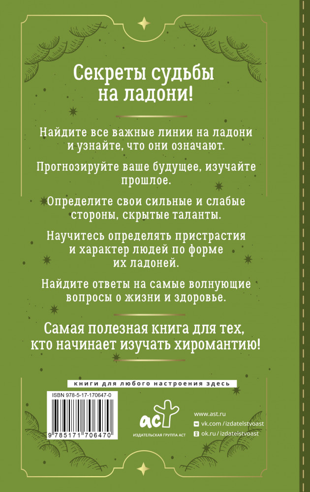💳 Оплатить за товар можно при получении 🇰🇿 Есть бесплатная доставка по Казахстану от 1 дня 🎁 Копите бонусы с каждой покупки Серия: Школа эзотерики Книга-самоучитель по хиромантии от известного Мастера. Простое и понятное руководство для тех, кто только начинает изучать искусство гадания по линиям на ладони. Книга написана доступным языком и содержит множество подробных иллюстраций. Вы сможете найти все главные линии на ладони, узнаете, что они означают, научитесь видеть варианты развития будущего и лучше понимать прошлое. В книге есть подробный анализ форм рук и ладоней, с его помощью вы сможете узнать о характере, увлечениях, скрытых мотивах и пристрастиях других людей. |