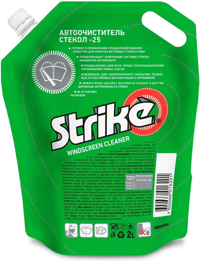 Автоочиститель стекол «Strike» создан для использования в зимний период и готов к применению при температуре воздуха до минус 25°С. Предотвращает замерзание системы стеклоомывателей автомобиля, благодаря высокому содержанию спиртов высшей степени очистки. Принципиально новый вид упаковки — многослойный ламинированный пакет, объем 2 литра. Для удобства переноски в верхней части сделана «Европросечка». Готовая к применению специализированная жидкость для стеклоомывателей ветровых автомобильных стекол и фар автомобилей любых марок. Предотвращает замерзание системы стеклоомывателя автомобиля. Эффективно удаляет дорожную грязь, масляную пленку, а так же другие дорожные загрязнения со стекол. Безопасен для лакокрасочного покрытия, резиновых и пластиковых деталей автомобиля.