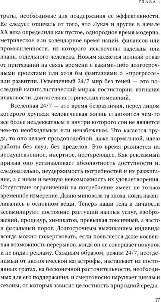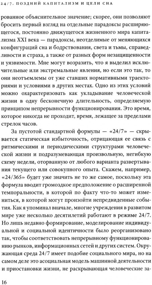 💳 Оплатить за товар можно при получении 🇰🇿 Есть бесплатная доставка по Казахстану от 1 дня 🎁 Копите бонусы с каждой покупки Джонатан Крэри исследует некоторые из разрушительных последствий непрерывных и расширяющихся процессов, характерных для капитализма XXI века, когда рынок непрестанно работает в режиме 24/7, подталкивая нас к постоянной активности и подтачивая многие формы общественного и политического самовыражения. Автор прослеживает, как неостановимое не-время размывает границы между вездесущим и безудержным потребительством и складывающимися сегодня стратегиями контроля и надзора; описывает постоянное управление человеческим вниманием и нарушение восприятия в рамках принудительных практик современной технологической культуры. В то же время он отмечает, что человеческий сон, будучи целительной передышкой, по своей сути несовместимой с капитализмом 24/7, указывает нам на другие, более грозные и более коллективные способы отказа от разрушающих мир моделей роста и накопления. |