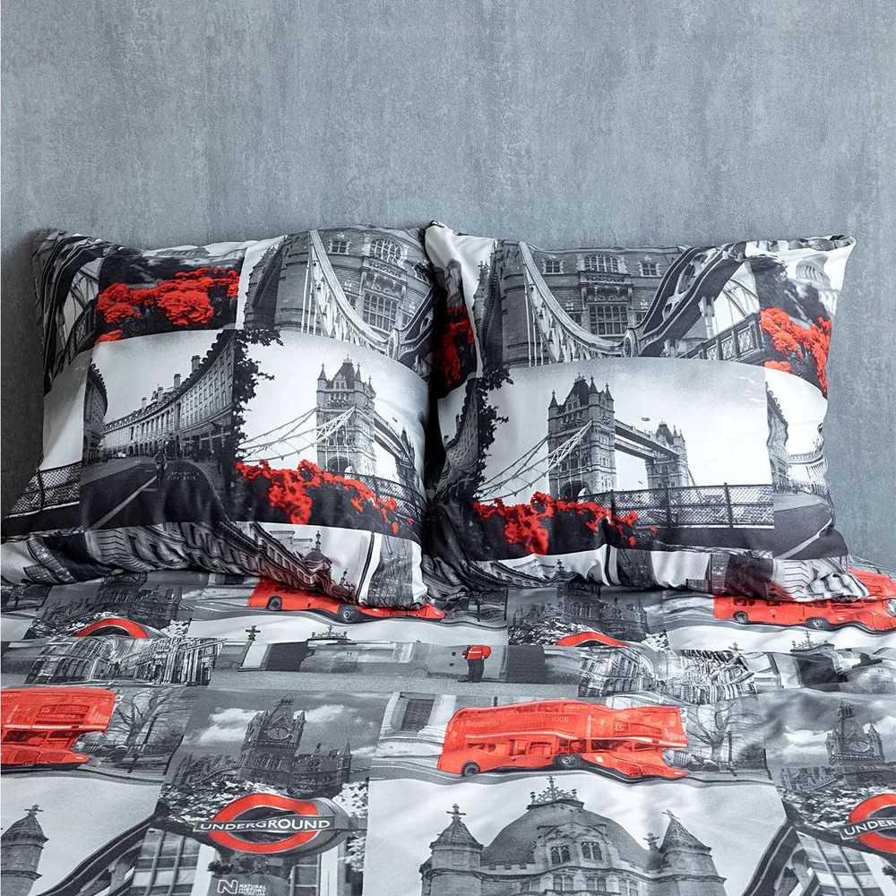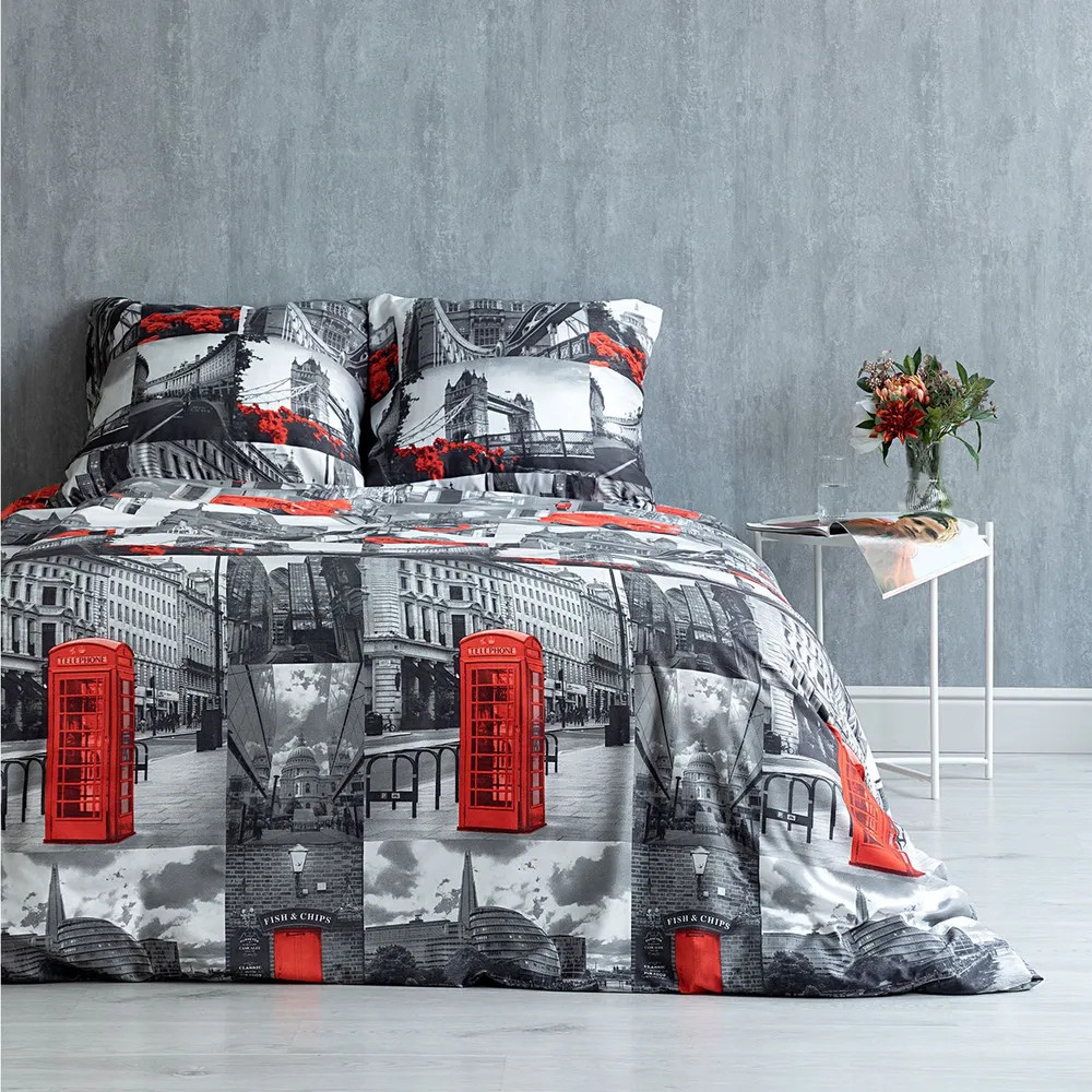 Постельное белье London bridge, вдохновленный атмосферой Англии, дополнит интерьер в лондонском стиле. Знаменитая английская телефонная будка станет ярким акцентом в спальне. Комплект выполнен из полисатина. Полисатин — это синтетическая ткань, которая формируется посредством сатинового переплетения полиэфировых нитей. При сатиновом плетении выполняется скрутка волокон двойным кручением — за счет этого материал обретает характерный блеск и прочность. Ткань приятная на ощупь, мягкая, износостойкая.