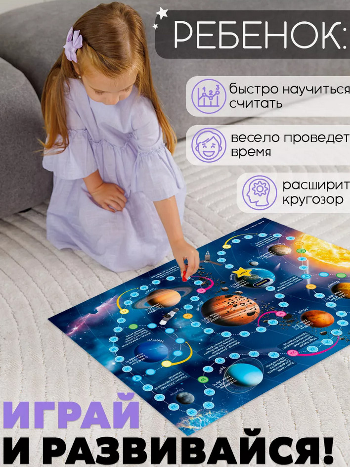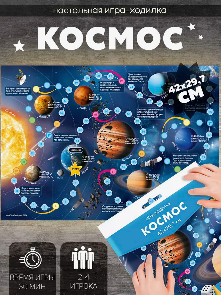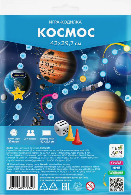 💳 Оплатить за товар можно при получении 🇰🇿 Есть бесплатная доставка по Казахстану от 1 дня 🎁 Копите бонусы с каждой покупки Новая игра-ходилка «Космос» имеет удобный формат и подойдёт для всей семьи. Разложите поле, выберите фишки и отправляйтесь в увлекательное путешествие по планетам Солнечной системы! Играя, можно узнать много нового! Компактное поле легко разложить и удобно брать с собой: игра складывается до формата А5. Игра тренирует счёт, развивает мелкую моторику и внимание. |