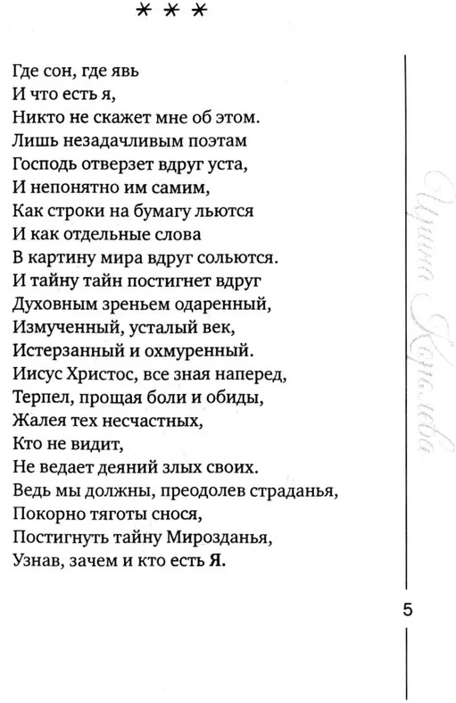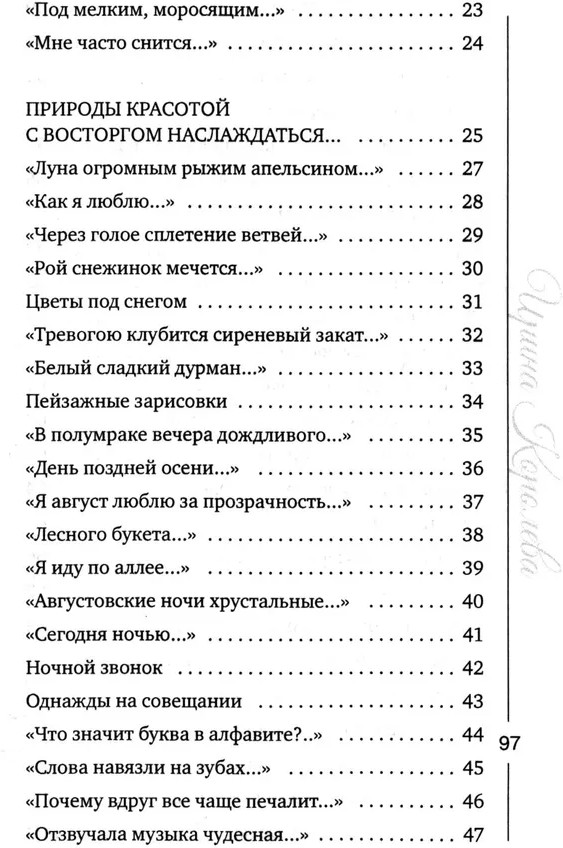 Серия: Современная поэзия Перед вами не просто сборник поэзии, а настоящая поэтическая исповедь, книга, в которой автор, Ирина Королева, с подкупающей искренностью раскрывает перед читателем свою душу, рассуждая о жизни, любви, Боге и природе — обо всем том, что занимает каждого человека. Ее пронзительная лирика заставляет отрешиться от приевшейся уже суеты и задуматься о вечных вопросах бытия |