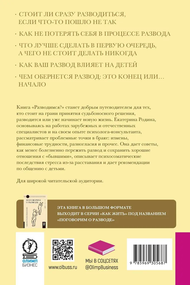 💳 Оплатить за товар можно при получении 🇰🇿 Есть бесплатная доставка по Казахстану от 1 дня 🎁 Копите бонусы с каждой покупки Серия: Как жить Книга «Разводимся?» станет добрым путеводителем для тех, кто стоит на грани принятия судьбоносного решения, разводится или уже начинает новую жизнь. |