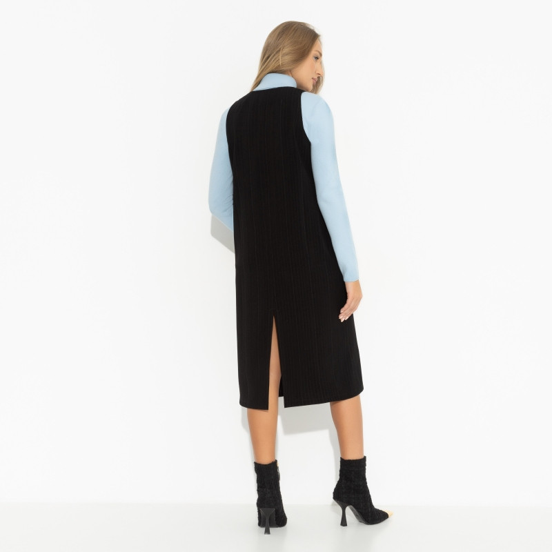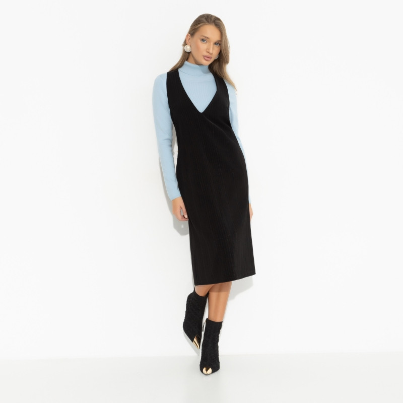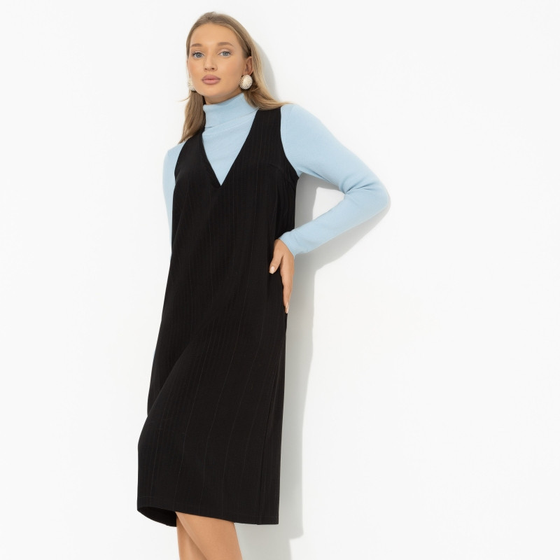 На фото сарафан выглядит, как чисто черного цвета. Но в живую имеются полоски. Похож на школьную форму, раньше у моего сына был такой костюм.