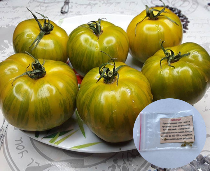 Томат Люсинда /Lucinda/ США. Выведен Фредом Хемпелем в Калифорнии. Индетерминантный, среднерослый (1,2-1,5 м), среднеспелый. Плоды округлые, оригинальной окраски, на светло-желто-зеленом фоне, темно-зеленые, полоски и штрихи, при полном созревании появляется желто-оранжевый оттенок. Редкий, оригинальный сорт. |
