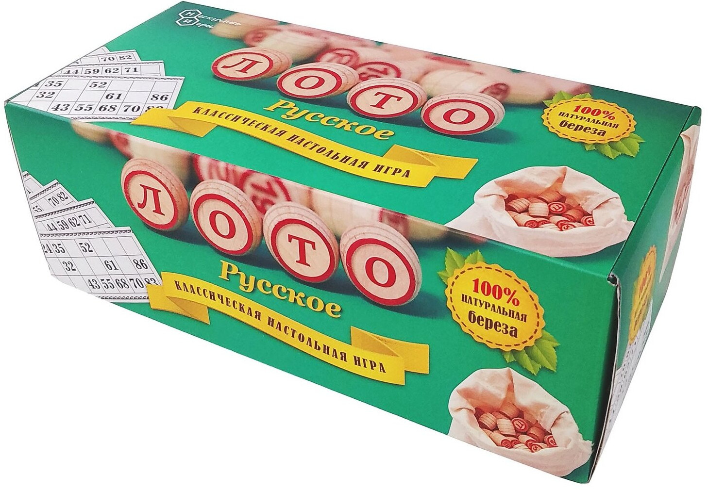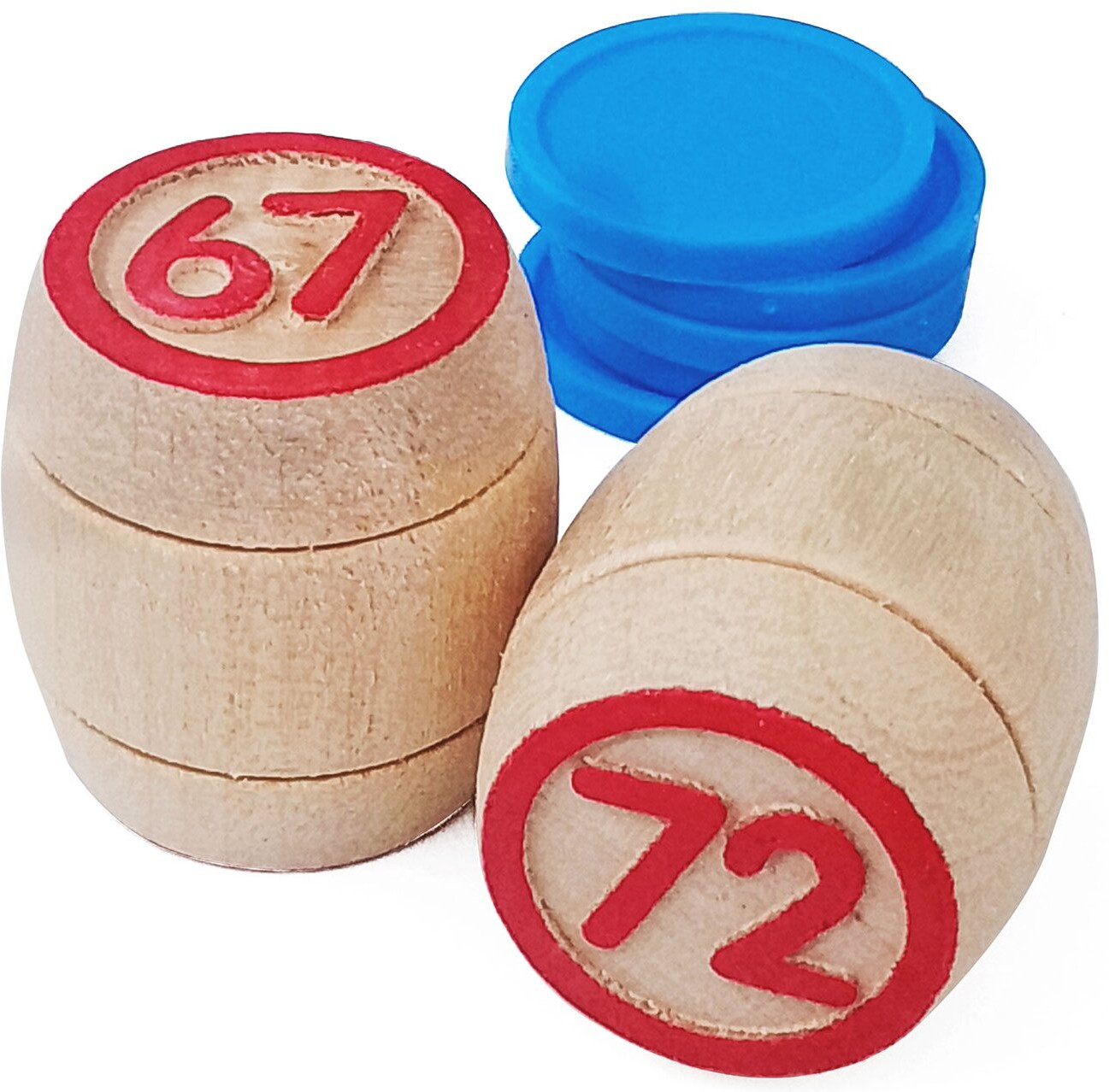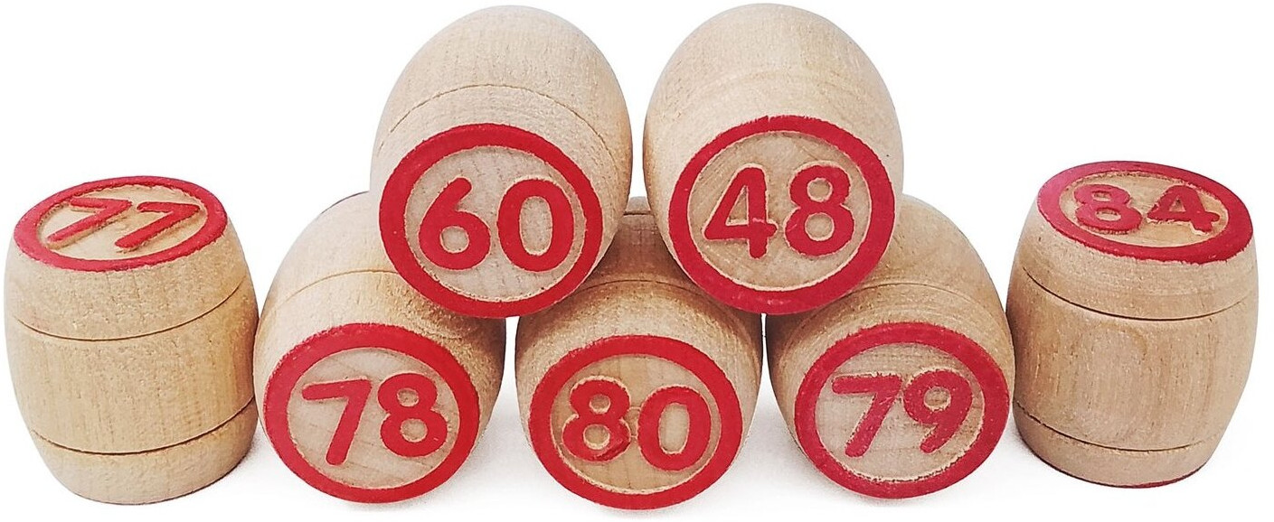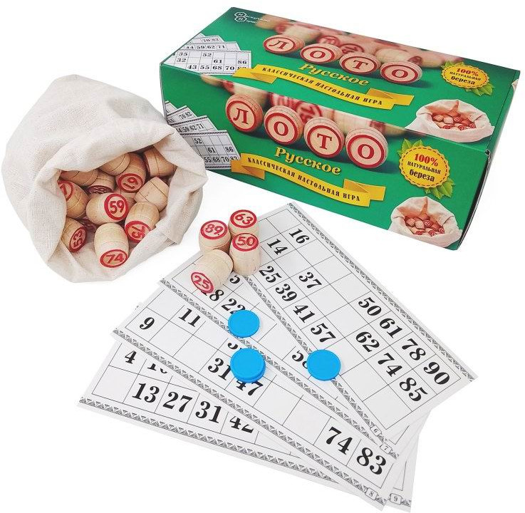 В игре используются 90 бочонков. На каждый бочонок с двух сторон нанесен его номер. Все бочонки кладутся в специальный непрозрачный мешок и перед началом игры тщательно в нём перемешиваются. Игровая карточка состоит из трёх строк, в каждой из которой 9 клеток, 5 из них занимают числа. Пустые клетки для игры не предназначены.