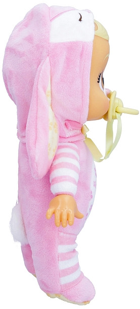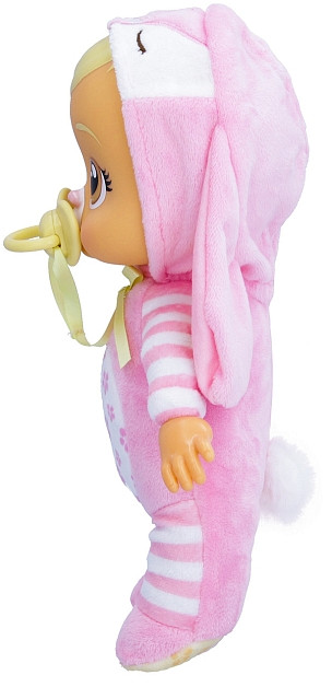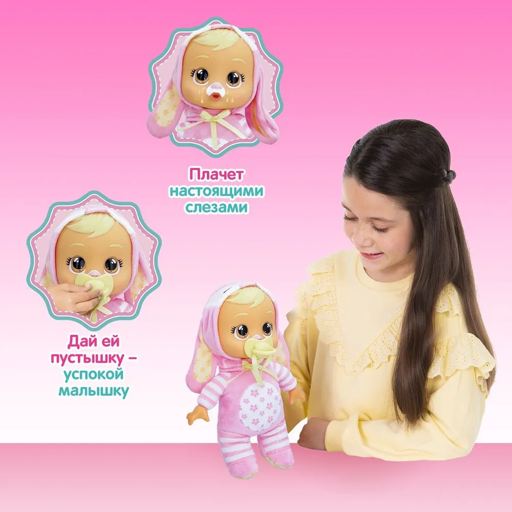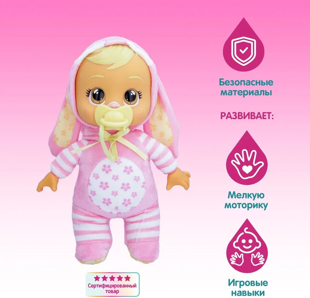 Не стоит расстраивать обворожительную малышку! Если забрать у нее пустышку и нажать на ее голову, она начнет плакать настоящими слезами. Обними Лолу и дай пустышку или расскажи ей веселую историю — и Зайка Малышка снова станет счастливой!