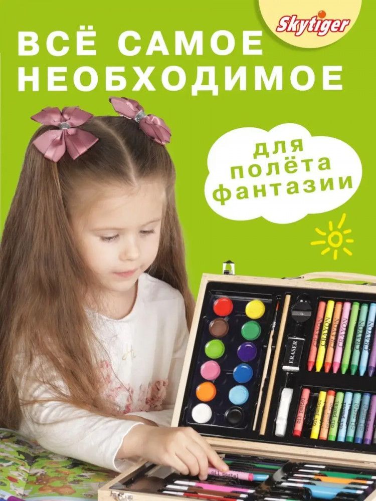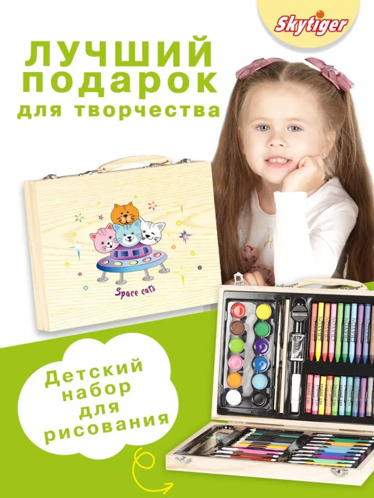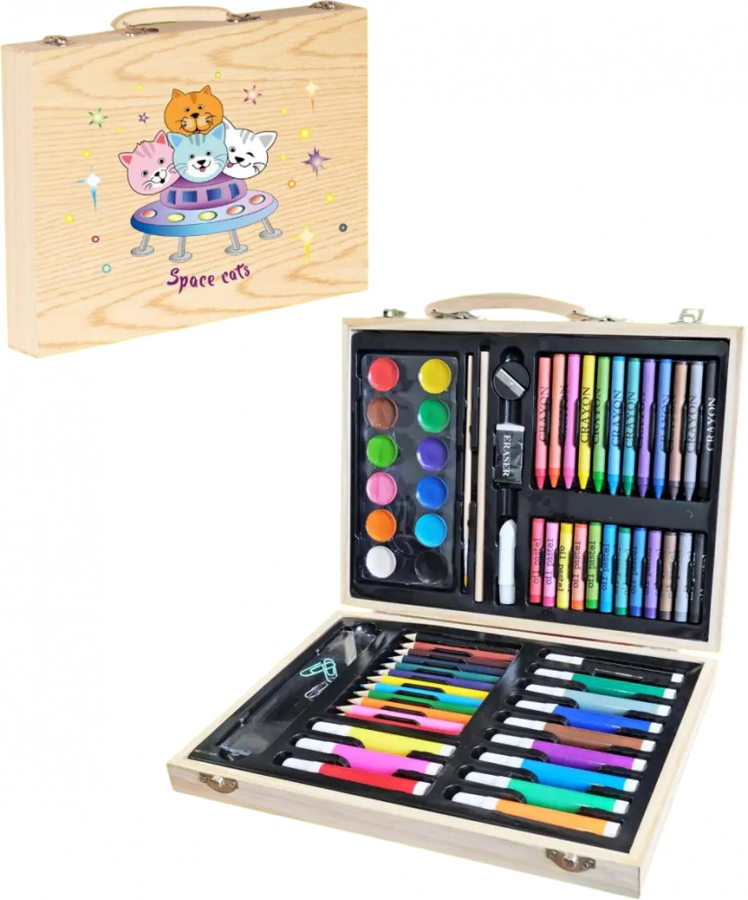 Skytiger Набор для рисования в деревянном чемодане «Котята в космосе»В данный момент этот товар отсутствует в продаже. Возможно, у нас найдется аналогичный или похожий товар здесь. Детский набор для рисования и творчества «Котята в космосе» (70 предметов) — это прекрасный подарок любому юному художнику. Рисовать можно красками, карандашами или восковыми мелками — выбор велик, потому что в наборе несколько видов принадлежностей для рисования! Набор содержит 70 предметов — всё, что нужно для создания разноцветных шедевров. Стильный и яркий дизайн кейса точно понравится любому ребёнку. Набор можно использовать дома, а также брать с собой в школу, детский сад или в дорогу. |