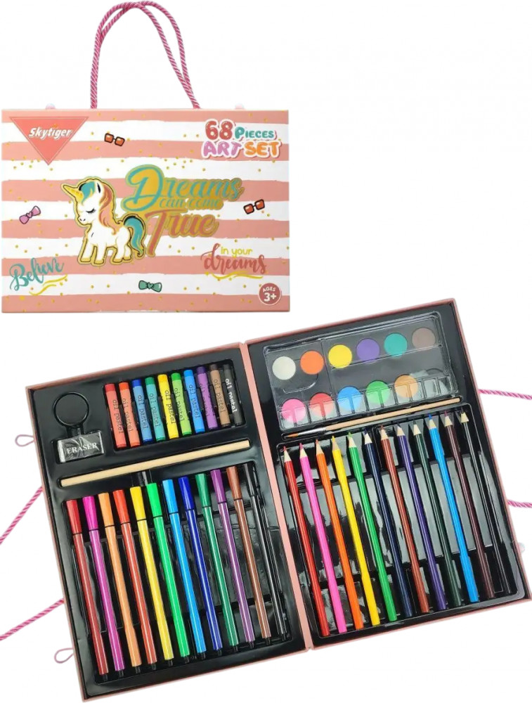 Skytiger Набор для рисования в чемодане «Единорог»В данный момент этот товар отсутствует в продаже. Возможно, у нас найдется аналогичный или похожий товар здесь. Детский набор для рисования и творчества — это прекрасный подарок любому юному художнику. Рисовать можно красками, карандашами или восковыми мелками — выбор велик, потому что в наборе несколько видов принадлежностей для рисования! Набор содержит 68 предметов — всё, что нужно для создания разноцветных шедевров. Стильный и яркий дизайн кейса точно понравится любому ребёнку. Набор можно использовать дома, а также брать с собой в школу, детский сад или в дорогу. |