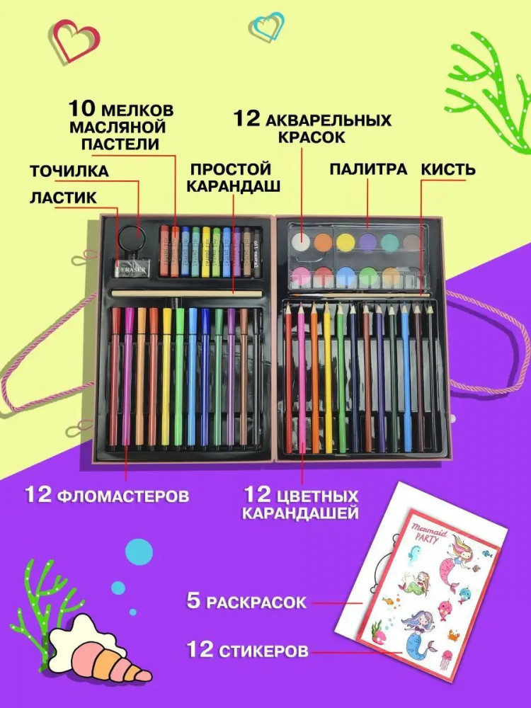 Skytiger Набор для рисования в чемодане «Русалка»В данный момент этот товар отсутствует в продаже. Возможно, у нас найдется аналогичный или похожий товар здесь. Детский набор для рисования и творчества — это прекрасный подарок любому юному художнику. Рисовать можно красками, карандашами или восковыми мелками — выбор велик, потому что в наборе несколько видов принадлежностей для рисования! Набор содержит 68 предметов — всё, что нужно для создания разноцветных шедевров. Стильный и яркий дизайн кейса точно понравится любому ребёнку. Набор можно использовать дома, а также брать с собой в школу, детский сад или в дорогу. |