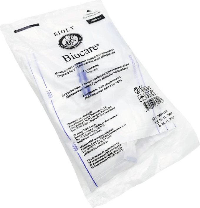 Мочеприемник Biocare стерильный однократного применения, объемом 1 л, модификации крепления: с ремешком, с завязками.