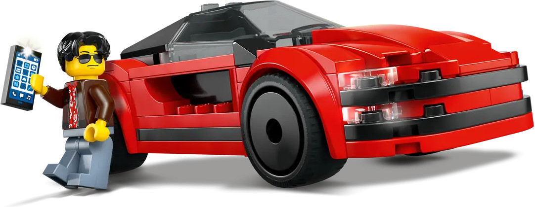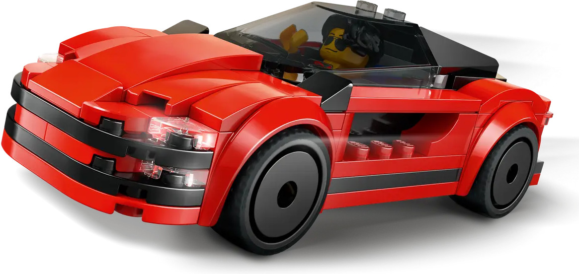 • набор включает детали для сборки красного спортивного автомобиля и минифигурку водителя;