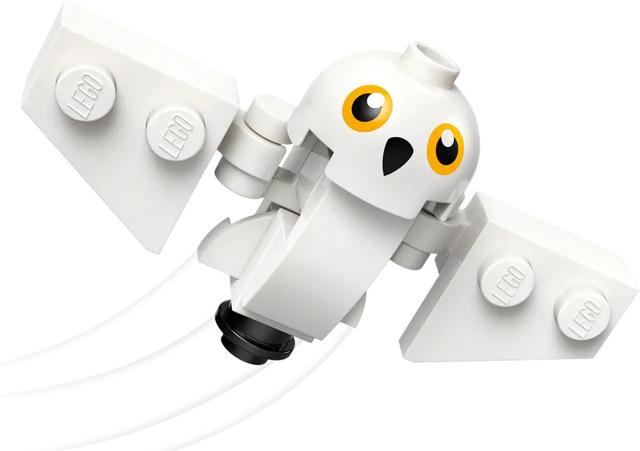 • 3 героя LEGO Harry Potter: минифигурки Гарри Поттера, Хедвига и Рубеуса Хагрида, едущие на летающем мотоцикле и коляске Хагрида;