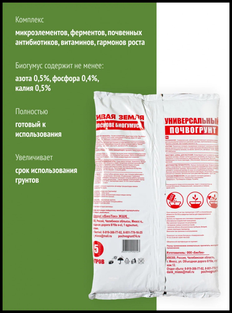Зеленый город Почвогрунт на основе биогумуса «Универсальный»В данный момент этот товар отсутствует в продаже. Возможно, у нас найдется аналогичный или похожий товар здесь. Имеет легкий, торфяной состав, хорошо пропускает воду с минеральными компонентами. Универсальный, полностью готовый, питательный грунт для комнатных растений, выращивания рассады, овощей и мульчирования почвы. Основные элементы питания не менее: азота — 0,5%, фосфора — 0,4%, калия — 0,5%. РН нейтрален. |