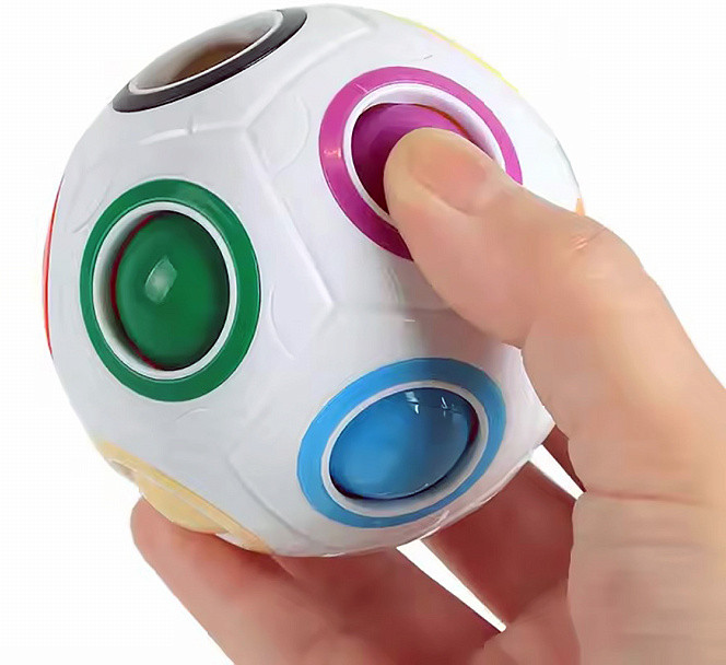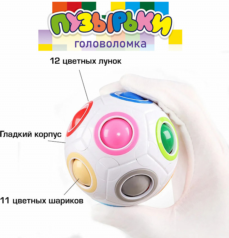 У этой несложной круглой головоломки, известной также под названиями Orbo и Cosmo, на поверхности 12 отверстий, обозначенных разными цветами. 11 цветных шариков находятся внутри и выглядывают через отверстия. Одно отверстие остается свободным, для того чтобы можно было перемещать шарики с места на место. Процесс игры похож на классическую игру «Пятнашки», хотя, конечно, это более интересный и красочный 3D-вариант. Пузырьки — головоломка начального уровня, которая понравится детям 4–7 лет. Для взрослых — это отличный фиджет-девайс, успокаивающая игрушка-антистресс для рук. Цель игры — расположить все цветные шарики в лунки соответствующих цветов. Это не так сложно, как кажется, но подумать и разобраться всё же придется!