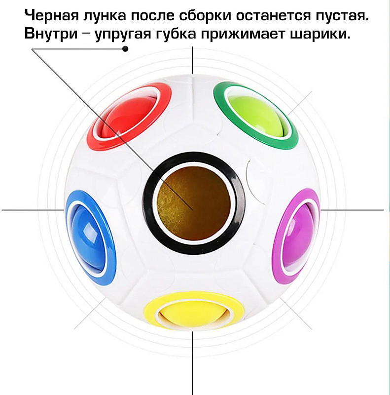 Как собирать головоломку: это простая головоломка, так что тут не будет формул или алгоритмов. Начните с заполнения нужным шаром выемки, противоположной от белой (бесцветной). Затем расставьте на свои места окружающие уже собранный цвет еще 5 шариков (на этом этапе у вас уже 6 собранных шаров!). Остается собрать второе полушарие головоломки — 5 цветов, расположенных вокруг бесцветной выемки, которая в конце игры должна остаться пустой. Используйте метод игры в пятнашки — свободная ячейка (например, белая) нужна как буфер-накопитель, куда ставится ненужный шар, чтобы освободить лунку, в которую вы хотите поставить шар соответствующего цвета. |