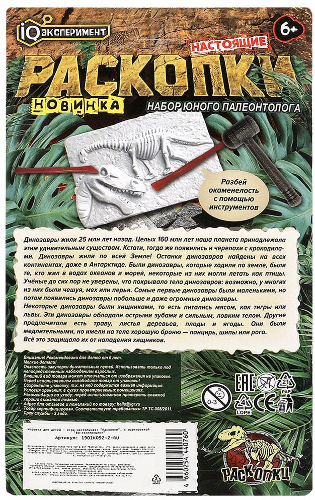 💳 Оплатить за товар можно при получении 🇰🇿 Есть бесплатная доставка по Казахстану от 1 дня 🎁 Копите бонусы с каждой покупки Серия: Настоящие раскопки Игровой набор «Настоящие раскопки» ТМ «IQ эксперимент» непременно понравится юным палеонтологам: |