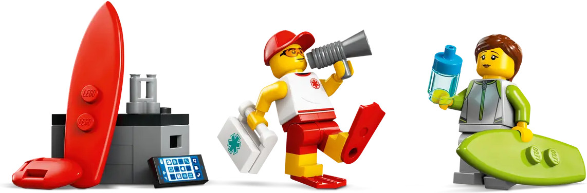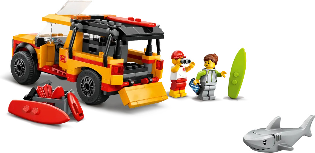 • в наборе есть все, что нужно детям для сборки внедорожника, минифигурок спасателей и серферов, а также игрушечной фигурки акулы для творческих игр;