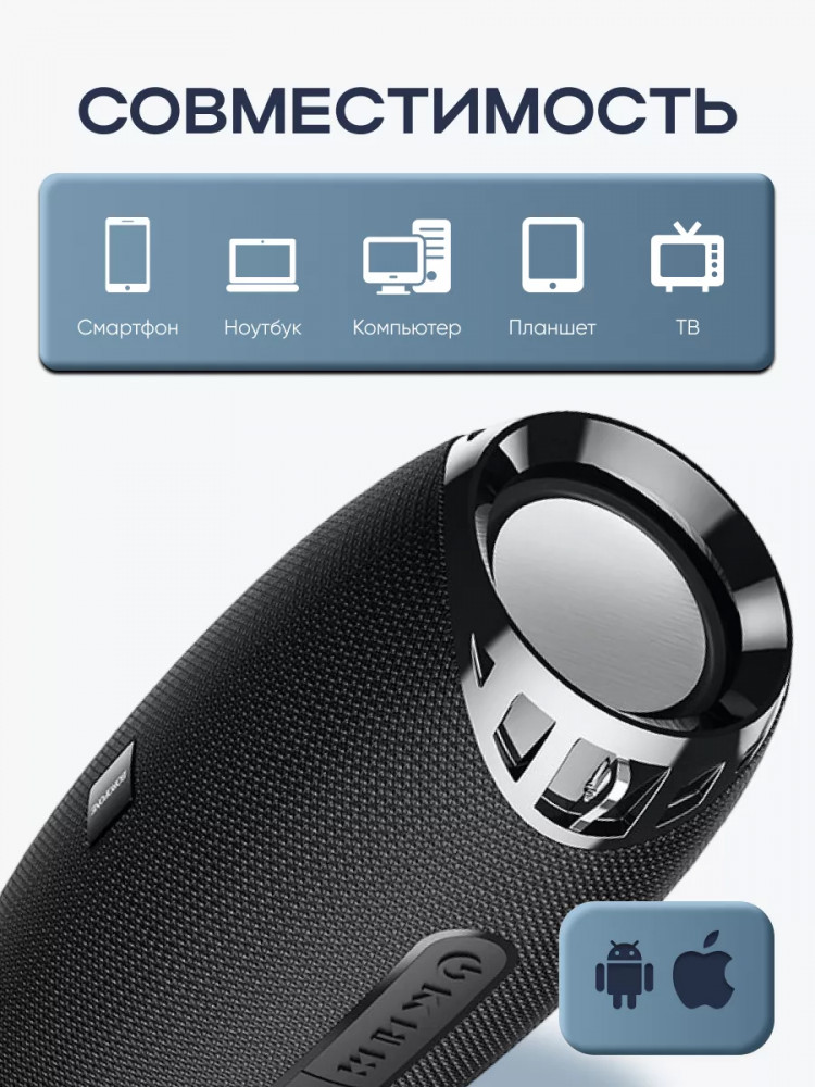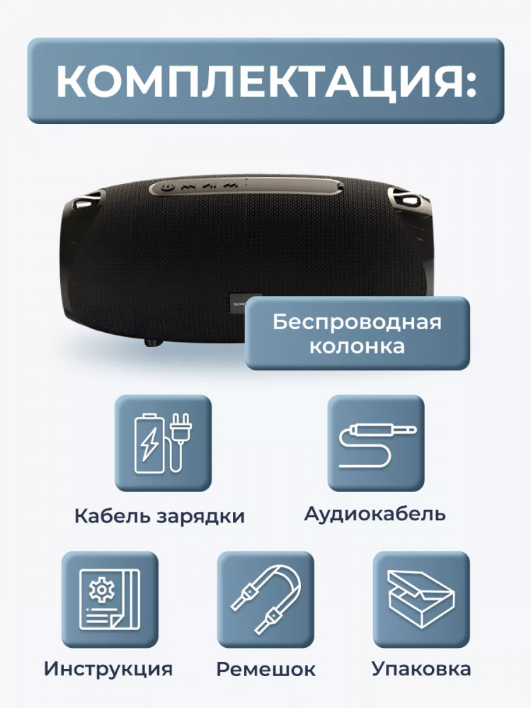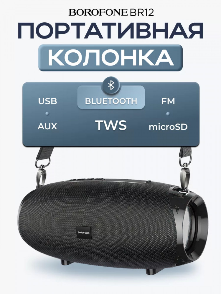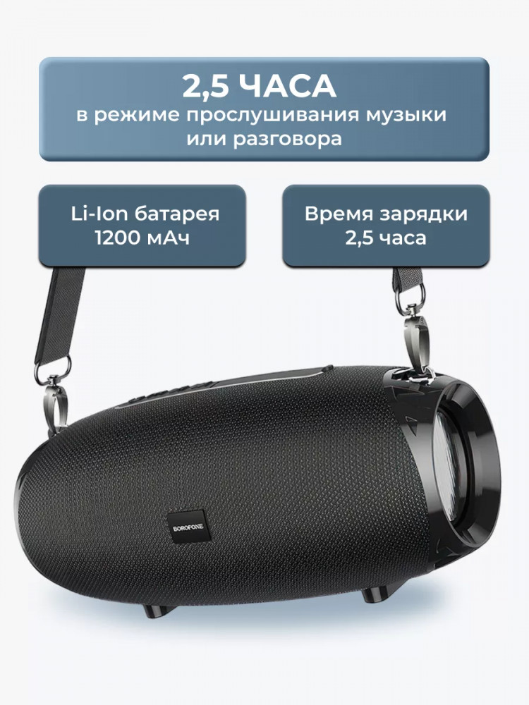 Borofone Колонка беспроводная музыкальная BR12В данный момент этот товар отсутствует в продаже. Возможно, у нас найдется аналогичный или похожий товар здесь. С маленькой аккумуляторной блютуз колонкой вы сможете наслаждаться музыкой не только дома, но и на прогулке или катаясь на велосипеде. Вес: 590г. Аудиосистема оснащена встроенным FM радиоприемником, имеет громкий динамик и кнопки управления. Также имеется встроенный микрофон для использования девайса в качестве hands free. Есть разъёмы для подключения юсб, аукс (jack 3.5) и карты памяти микро сд (TF). Заряжается от сети и держит заряд аккумулятора в течение долгого времени — до 2,5 часов. Чистая акустика, небольшой вес, мощная батарея — это не все плюсы музыкальной колонки. В комплект входят 2 кабеля: для питания от сети и зарядки, а также шнур AUX. К акустической колонке можно подключить компьютерные наушники, mp3 плеер , стереосистему, телевизор, телефон, юсб — накопитель (флешку), аудио проигрыватель и другую технику. |