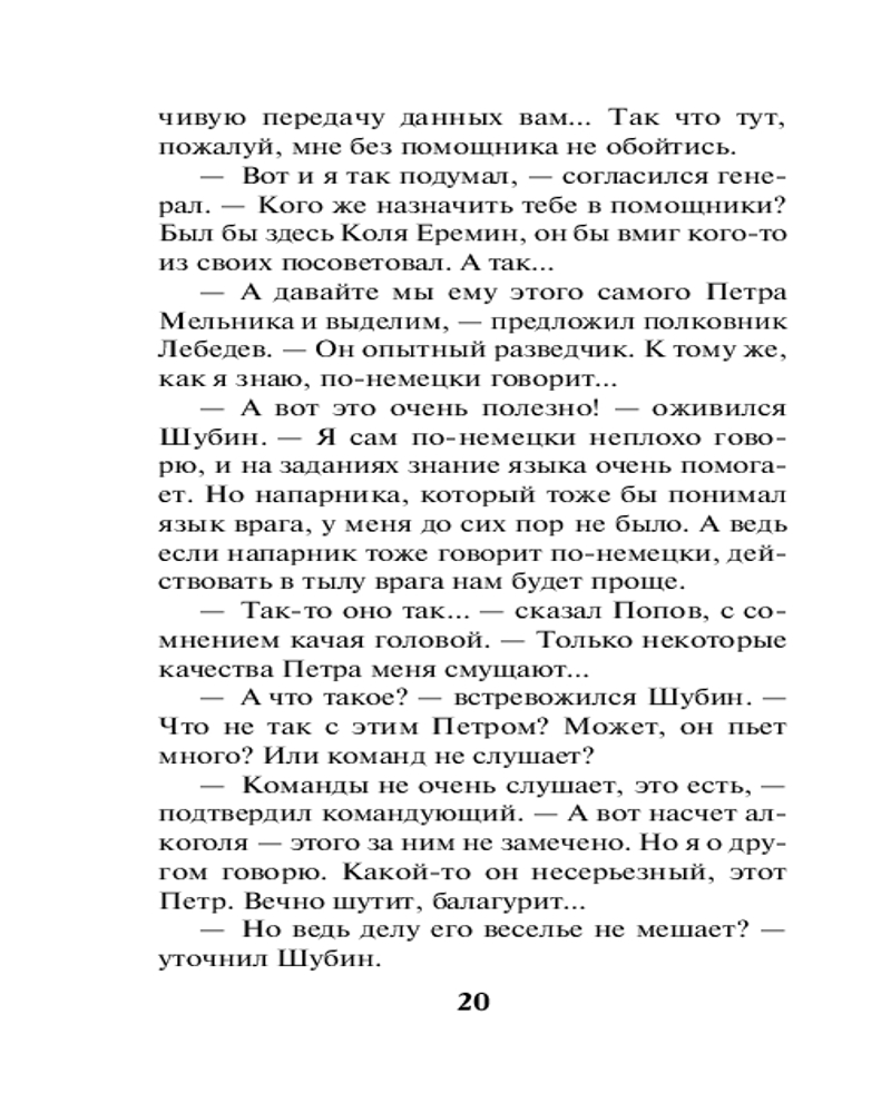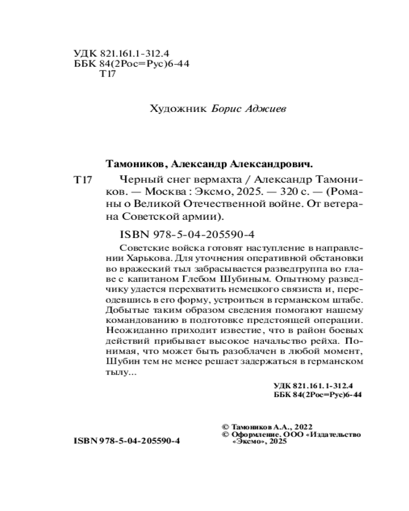 Чёрный снег вермахтаАлександр Александрович Тамоников В данный момент этот товар отсутствует в продаже. Возможно, у нас найдется аналогичный или похожий товар здесь. Серия: Романы о Великой Отечественной войне. От ветерана Советской армии (обложка) Советские войска готовят наступление в направлении Харькова. Для уточнения оперативной обстановки во вражеский тыл забрасывается разведгруппа во главе с капитаном Глебом Шубиным. Опытному разведчику удается перехватить немецкого связиста и, переодевшись в его форму, устроиться в германском штабе. Добытые таким образом сведения помогают нашему командованию в подготовке предстоящей операции. Неожиданно приходит известие, что в район боевых действий прибывает высокое начальство рейха. Понимая, что может быть разоблачен в любой момент, Шубин тем не менее решает задержаться в германском тылу... |