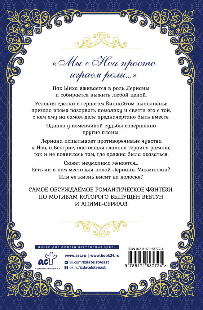 💳 Оплатить за товар можно при получении 🇰🇿 Есть бесплатная доставка по Казахстану от 1 дня 🎁 Копите бонусы с каждой покупки Серия: Новелла. Лериана, невеста герцога по контракту Пак Ынха вживается в роль Лерианы и собирается выжить любой ценой. Условия сделки с герцогом Виннайтом выполнены: пришло время разорвать помолвку и свести его с той, с кем ему на самом деле предначертано быть вместе. Однако у изменчивой судьбы совершенно другие планы. Лериана испытывает противоречивые чувства к Ноа, а Беатрис, настоящая главная героиня романа, так и не появилась там, где должна была оказаться. Сюжет неумолимо меняется... Есть ли в нем место для новой Лерианы Макмиллан? Или ее жизнь висит на волоске? |