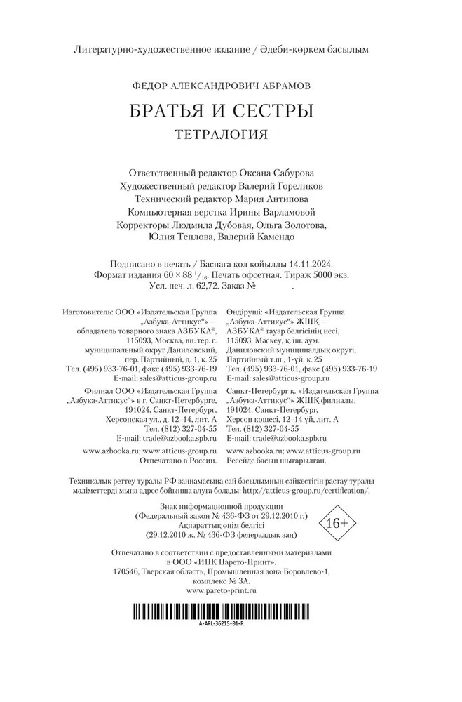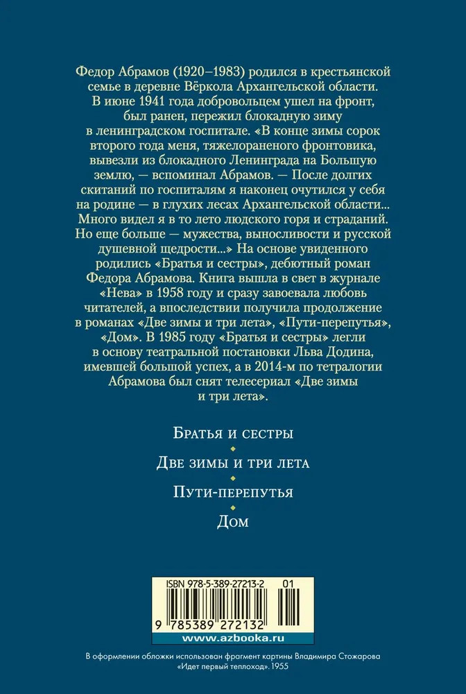 Серия: Русская литература. Большие книги Фёдор Абрамов (1920–1983) родился в крестьянской семье в деревне Веркола Архангельской области. В июне 1941 года добровольцем ушёл на фронт, был ранен, пережил блокадную зиму в ленинградском госпитале. «В конце зимы сорок второго года меня, тяжелораненого фронтовика, вывезли из блокадного Ленинграда на Большую землю, — вспоминал Абрамов. — После долгих скитаний по госпиталям я наконец очутился у себя на родине — в глухих лесах Архангельской области... Много видел я в то лето людского горя и страданий. Но еще больше — мужества, выносливости и русской душевной щедрости...» На основе увиденного родились «Братья и сёстры», дебютный роман Фёдора Абрамова. Книга вышла в свет в журнале «Нева» в 1958 году и сразу завоевала любовь читателей, а впоследствии получила продолжение в романах «Две зимы и три лета», «Пути-перепутья», «Дом». |