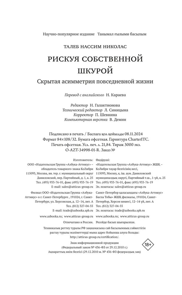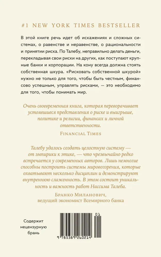 💳 Оплатить за товар можно при получении 🇰🇿 Есть бесплатная доставка по Казахстану от 1 дня 🎁 Копите бонусы с каждой покупки Серия: Азбука-Бизнес В своей резко провокационной и одновременно предельно прагматичной книге неподражаемый Нассим Талеб рассказывает, как важно идентифицировать и фильтровать чушь, отличать теорию от практики, поверхностную компетентность от настоящей. Вы узнаете, что такое рациональность в сложных системах и реальном мире, симметрия и асимметрия и в чем состоит логика принятия рисков. Наполняя новым смыслом привычные понятия, такие как «справедливое общество», «профессиональный успех», «личная ответственность», и не боясь задеть эго признанных кумиров, Талеб развенчивает лицемерие идеологов военных интервенций в Ирак и Ливию; фиаско нобелевских лауреатов по экономике, разоривших банки и инвестиционные фонды; лживых религиозных проповедников. На примерах Хаммурапи и Иисуса Христа, римских и византийских императоров, философов-стоиков и современных успешных бизнесменов Талеб показывает, что главное качество, объединяющее их всех, — «ставить на кон свою шкуру и душу», а не переносить риск на других. |