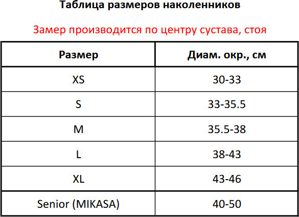 Для определения размера наколенников необходимо измерить обхват ноги на 8 см выше середины колена. Размеры: