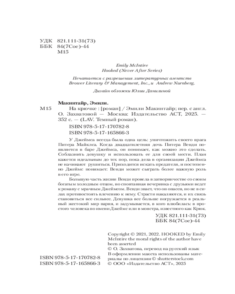 💳 Оплатить за товар можно при получении 🇰🇿 Есть бесплатная доставка по Казахстану от 1 дня 🎁 Копите бонусы с каждой покупки Серия: LAV. Темный роман У Джеймса всегда была одна цель: уничтожить своего врага Питера Майклса. Когда двадцатилетняя дочь Питера Венди появляется в баре Джеймса, он понимает, как можно это сделать. Соблазнить девушку и использовать ее для своей мести. План кажется идеальным до тех пор, пока дела в организации не начинают рушиться. Приходится искать предателя, и постепенно Джеймс понимает: Венди может сыграть более важную роль в его игре. |