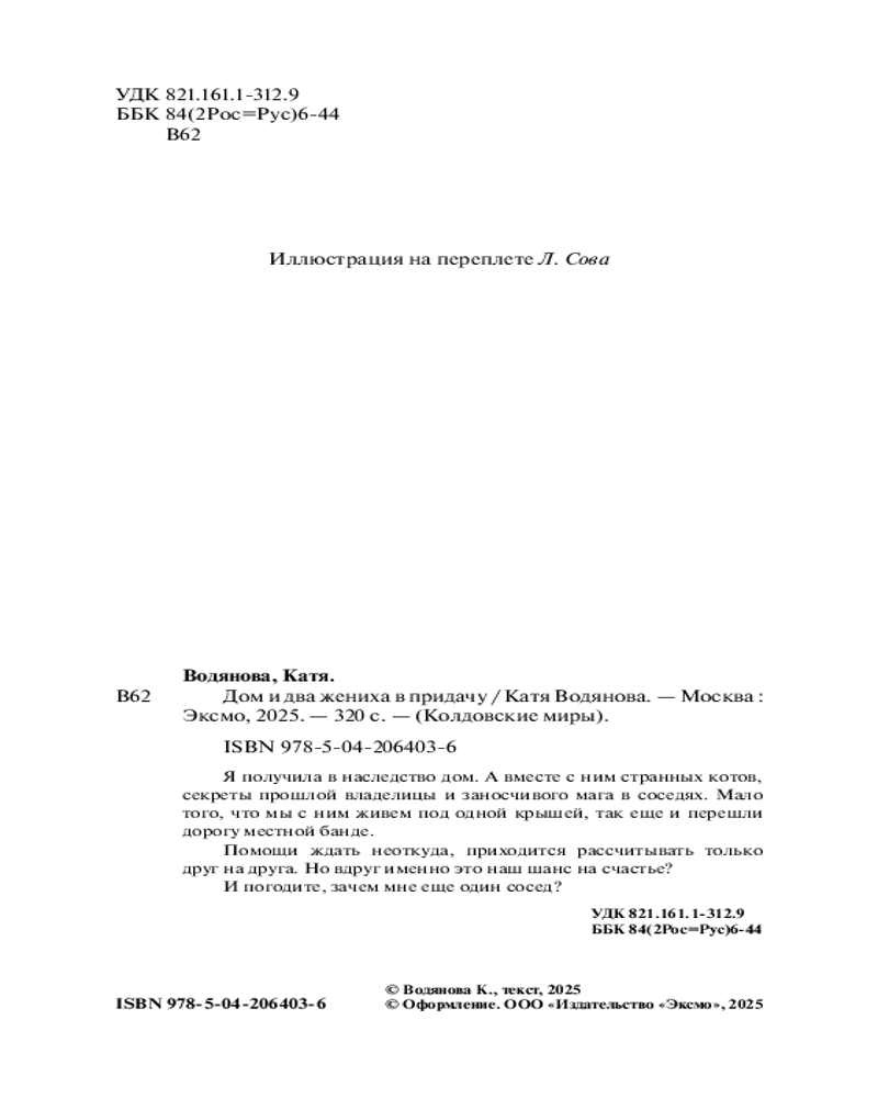 💳 Оплатить за товар можно при получении 🇰🇿 Есть бесплатная доставка по Казахстану от 1 дня 🎁 Копите бонусы с каждой покупки Серия: Колдовские миры. Новое оформление Я получила в наследство дом. А вместе с ним странных котов, секреты прошлой владелицы и заносчивого мага в соседях. Мало того, что мы с ним живем под одной крышей, так еще и перешли дорогу местной банде. |