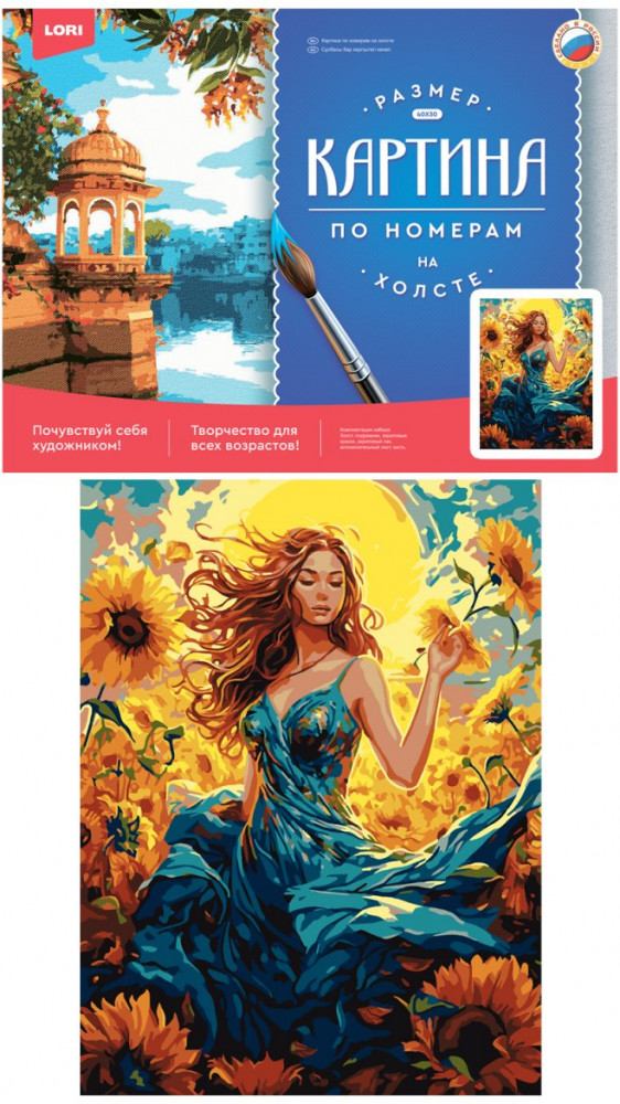 В набор входят: холст на деревянном подрамнике с контуром, акриловые краски, кисть, вспомогательный лист, акриловый лак.
